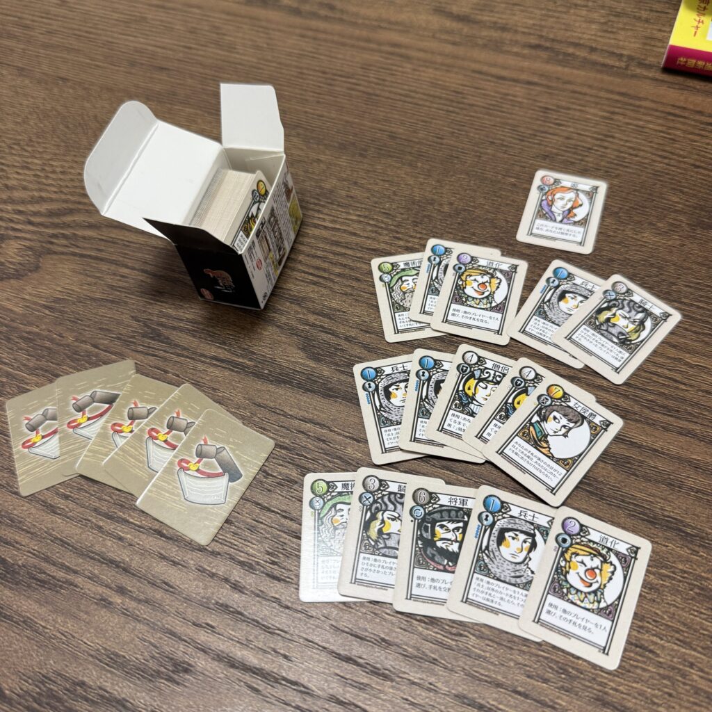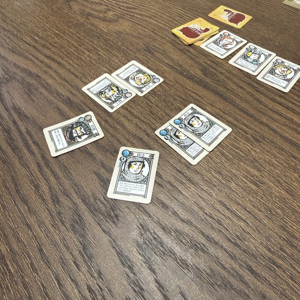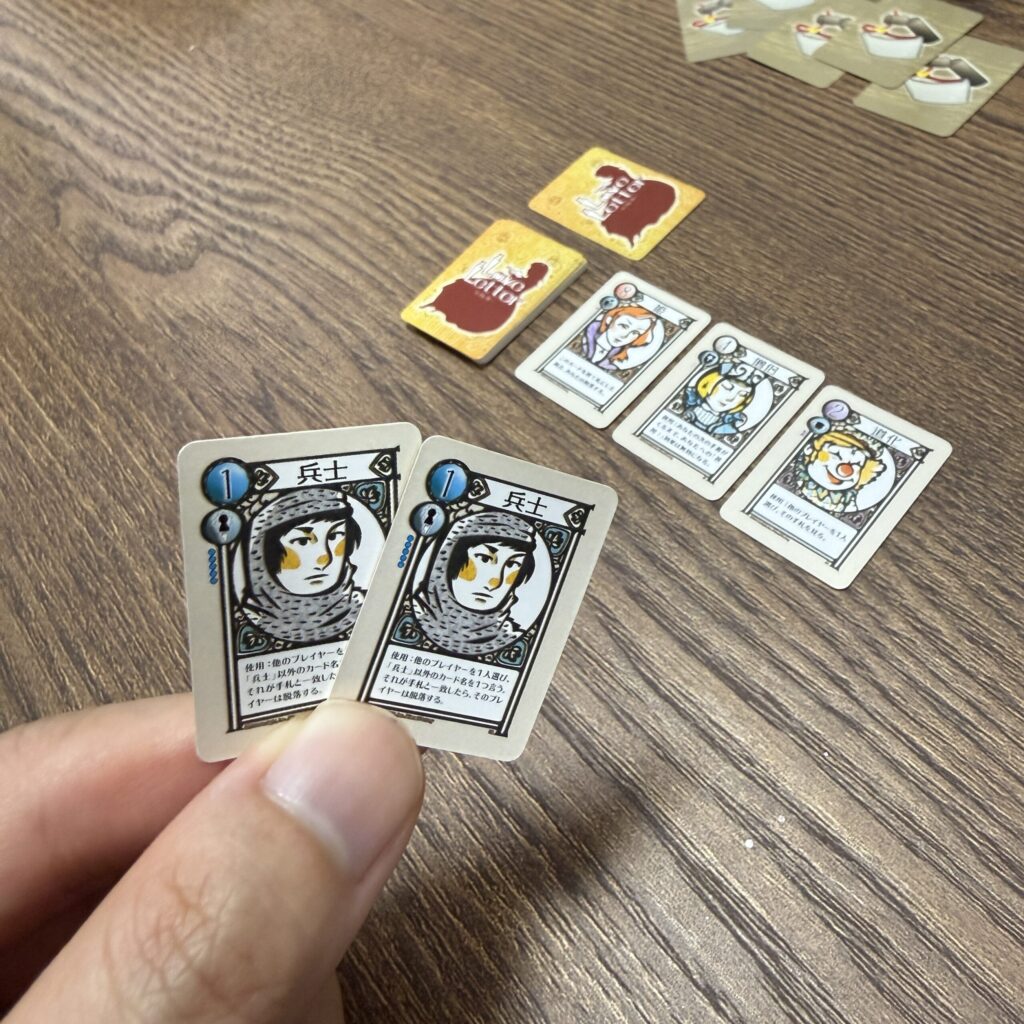 久しぶりに遊んでみましたが、改めてシビアなゲームだと感じました。兵士の能力で初手で脱落させられたり、兵士しか手札にこない時に騎士で数字比べ仕掛けられて脱落したりと散々な目に遭いました。