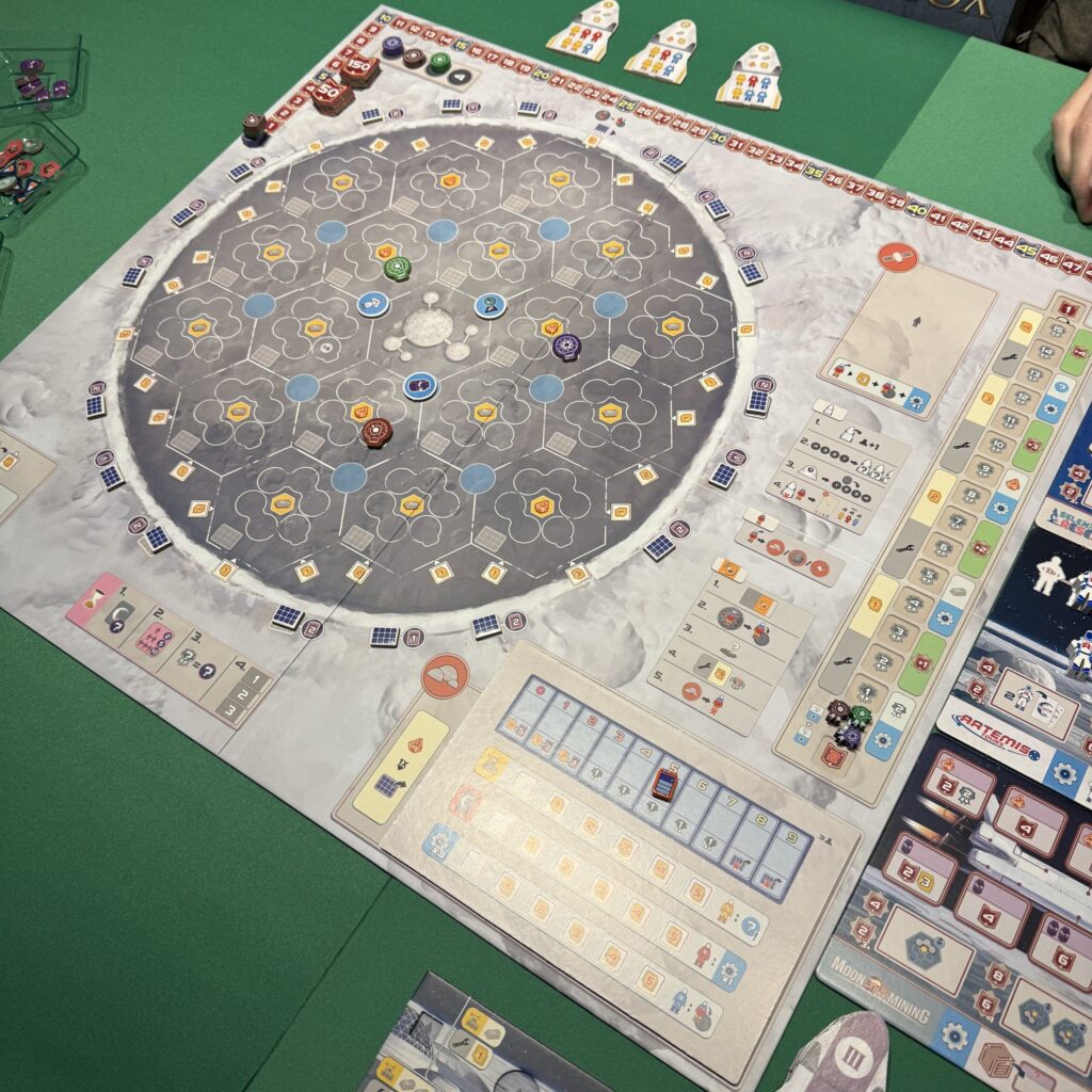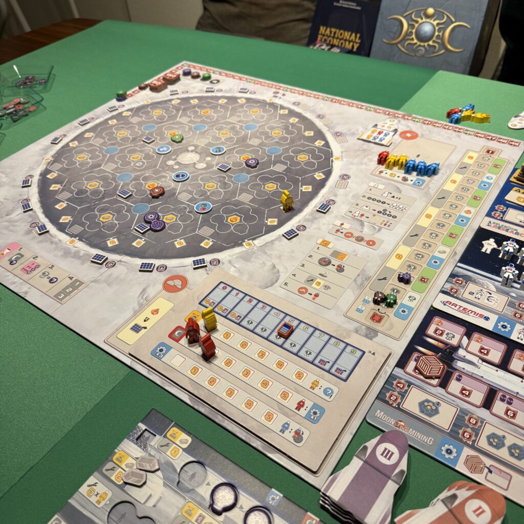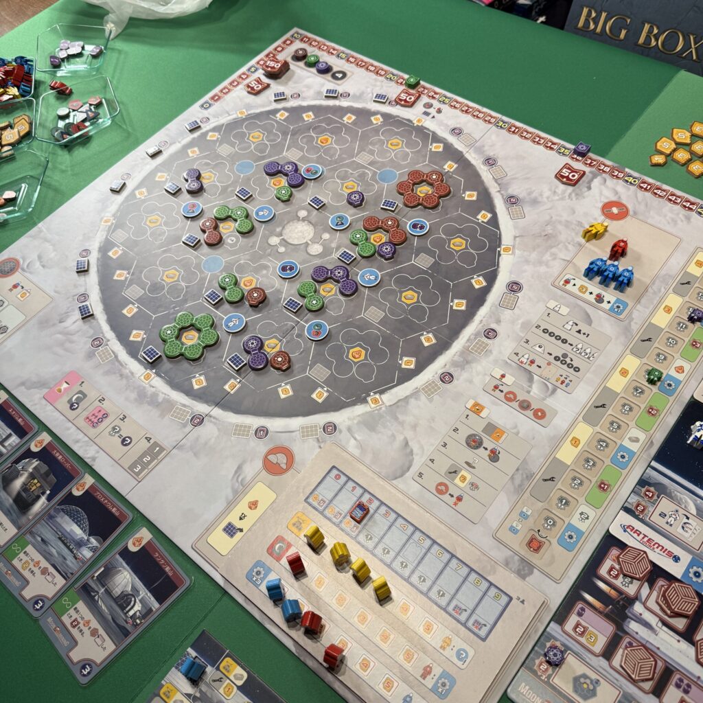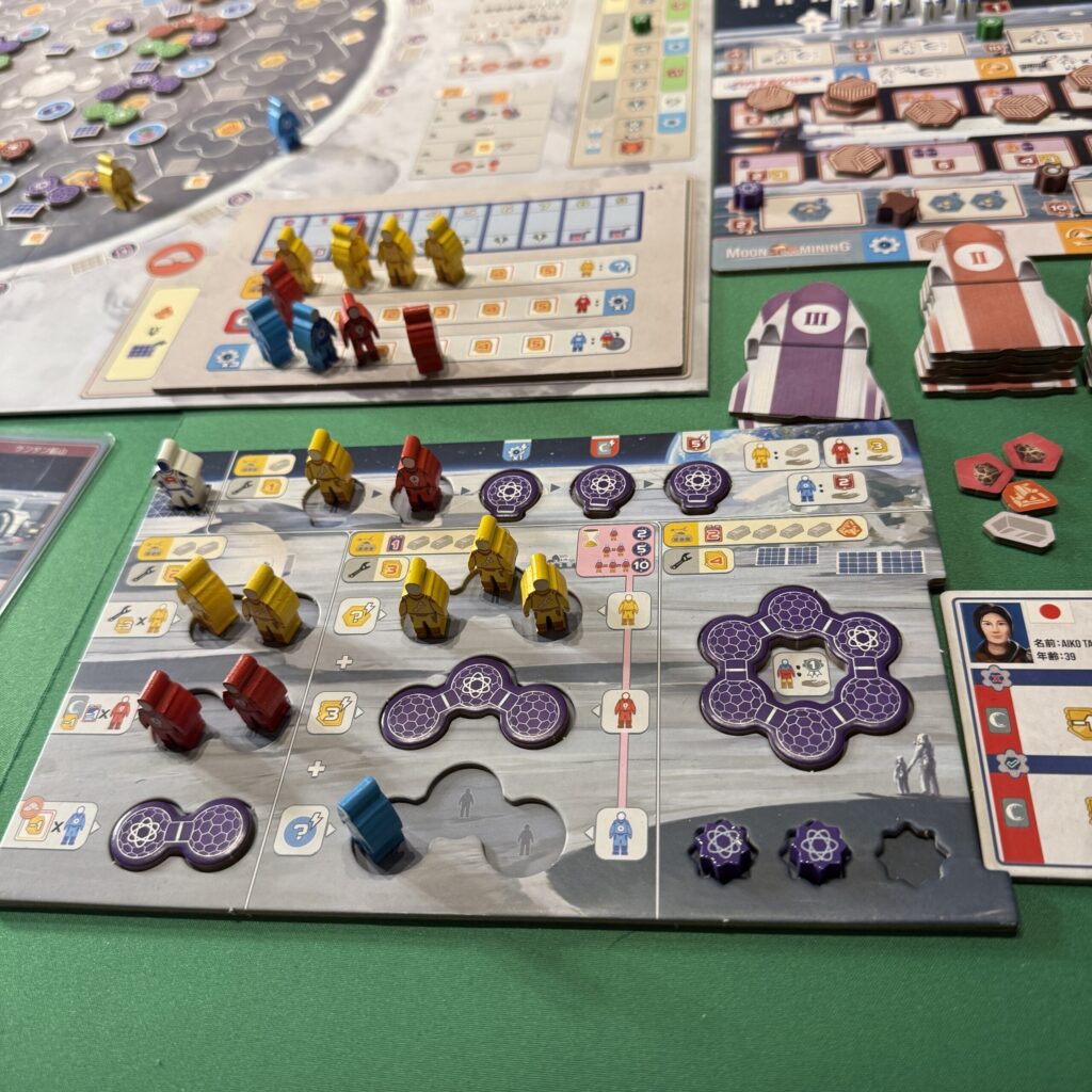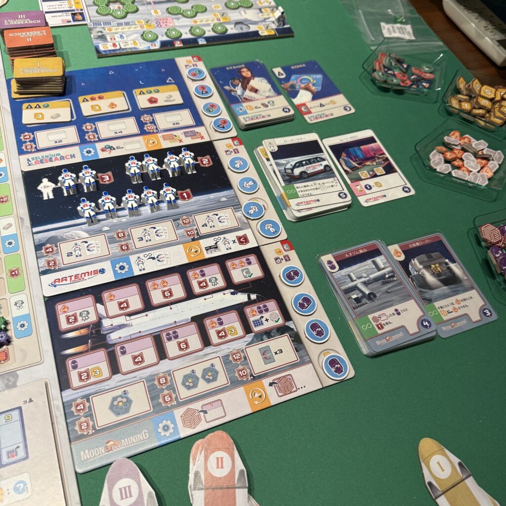 いつも様々なボードゲームを一緒に遊んでいただいている方と3人対戦。今回のゲームに使うのは、マニュアルで初回プレイに推奨される3つの企業、①セレニウム・リサーチ②アルテミス・ツアーズ③ムーン・マイニング。①セレニウム社は企業固有リソースのリソースマネジメント、②アルテミス社は観光客のピック&デリバリーライク、③ムーン社はリワードの早取り、をそれぞれ特徴にしている印象を覚えた。