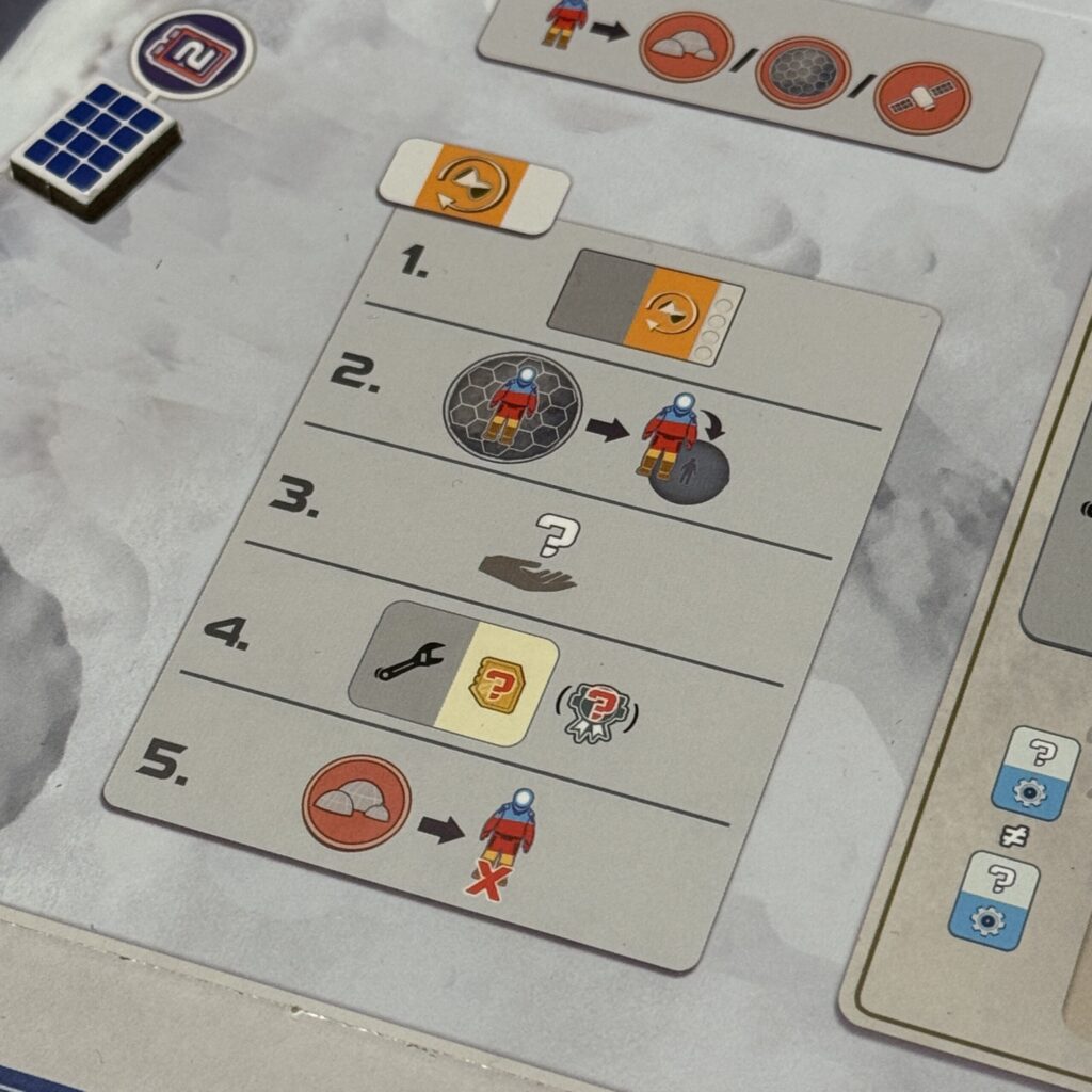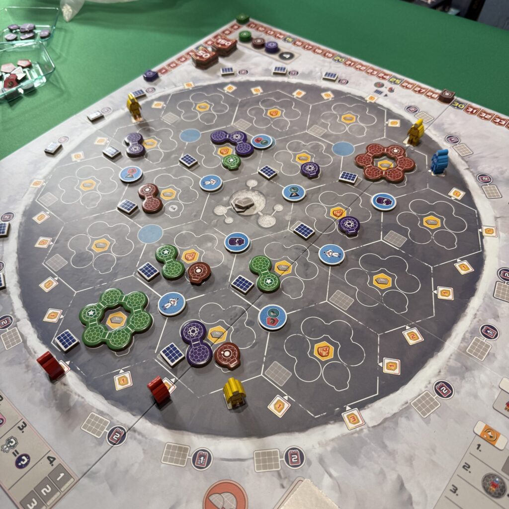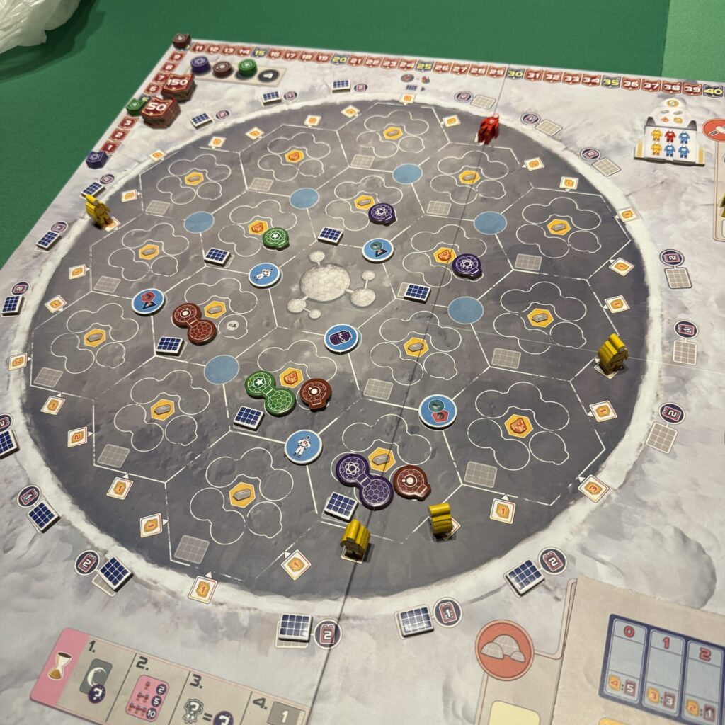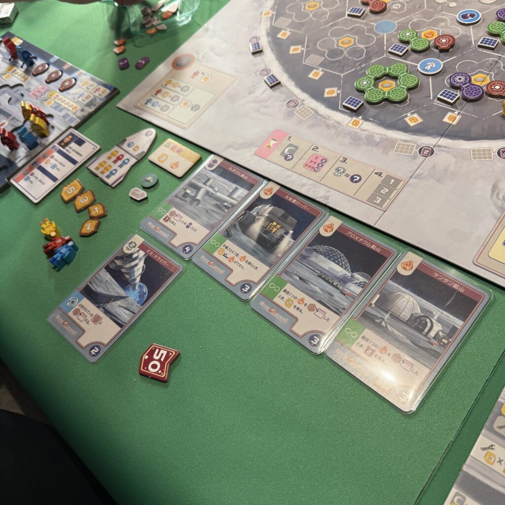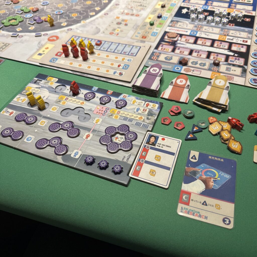 セットアップを完了させて、いざゲーム開始。BGG Weight 3.88(25/12/7時点)は伊達ではなく、どんな戦略でプレイすれば良いのか検討がつけられない。自分の機関リーダーは日本、プロジェクト投資のクレジット負担を減らしてくれる。自分は初期配置で、”セレニウム社” の恩恵を受けやすい場所にドームを建てた。一旦、この企業の固有リソースの活用方法を模索しながらプレイを進めてみる。ドームの初期配置によって、どの企業の恩恵を受けやすいかが分かり、それをプレイ指針の一つにできるのは助かる。