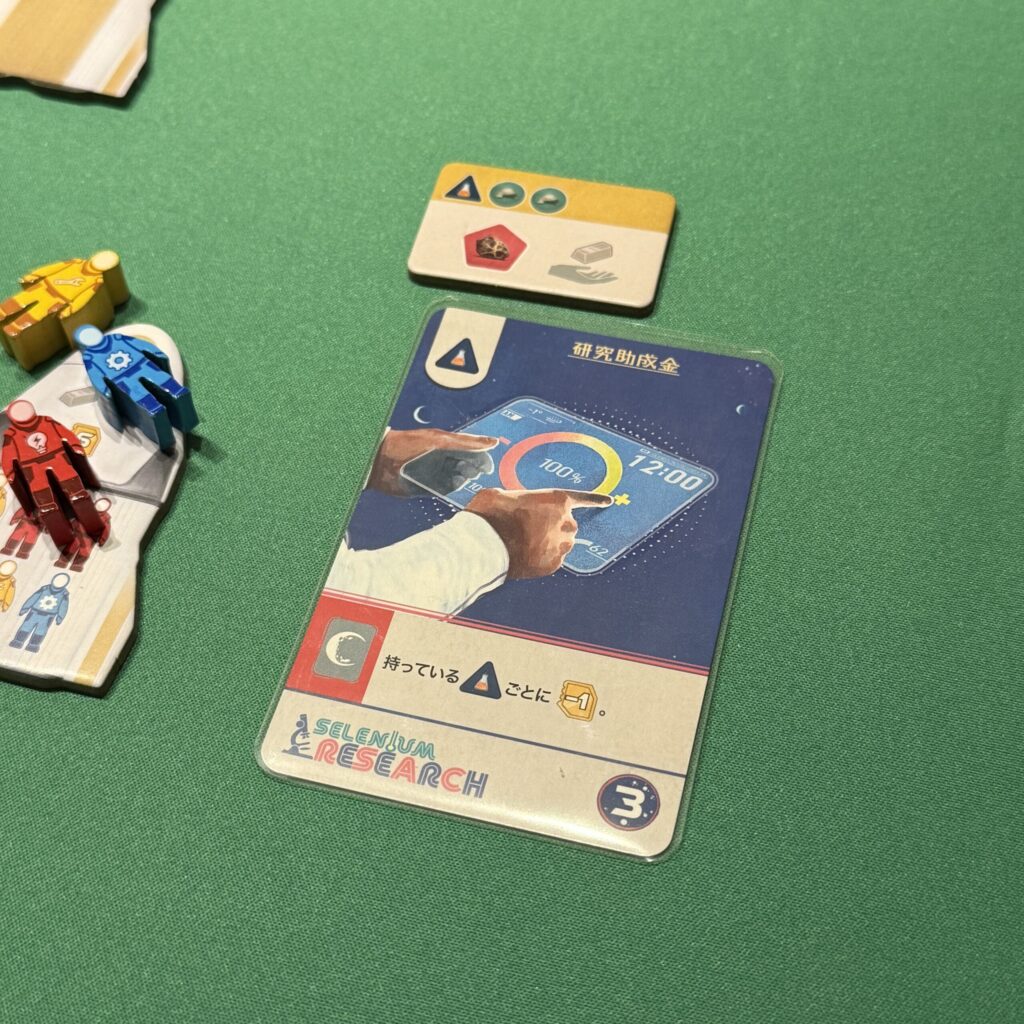 手探りしながら1ラウンド目のアクションフェイズが終了。今後の戦略を考えてみる。セレニウム社の企業トークンを盤面に展開し、科学者のクレーター開拓で一気に固有リソース集める。そして、実験タイルと引き換えてゲームを有利に進める。企業トークンを置いていくと、その企業のプロジェクト投資の負担が増すのだが、そこは機関リーダーとプロジェクトカードの効果でカバーする。これでいってみよう。