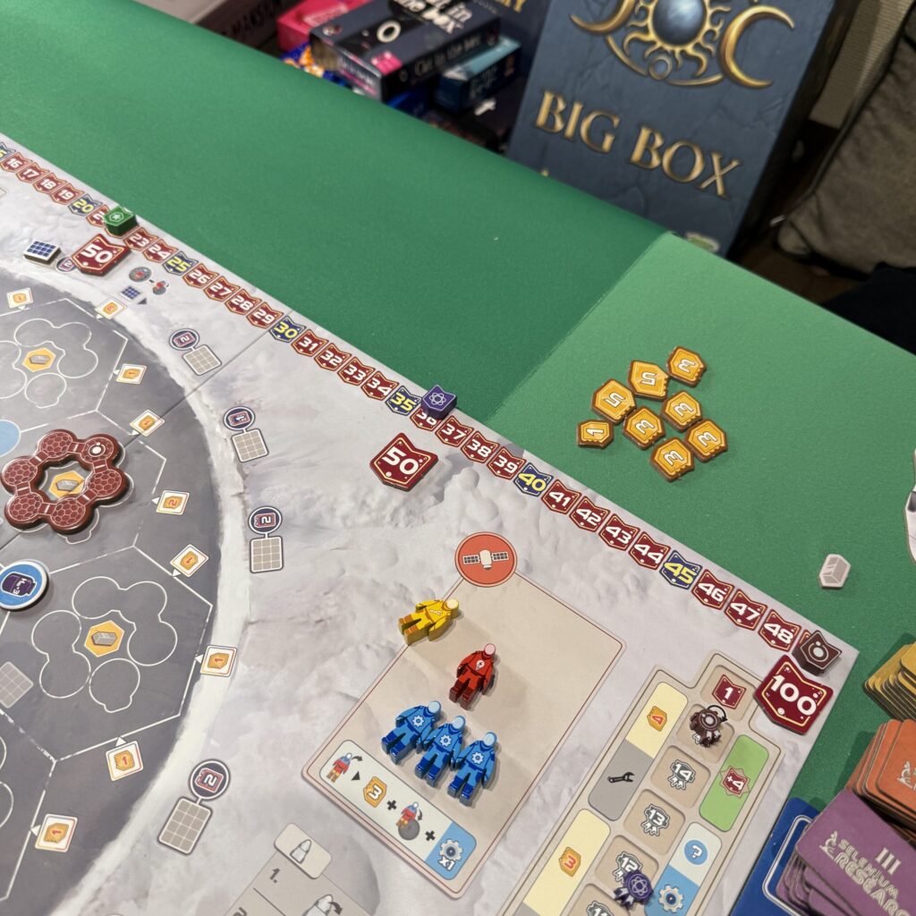 今回の “シャクルトンベース” は、自身が抱くワカプレの様相とは違ったものでした。このゲーム、クレーターの開拓状況によって、アクション強度が流動的に変化していきます。自分が恩恵を受けるスペースであったはずが、クレーター上のマジョリティが変化していくことで、自分に不利なスペースになることがあります。ワカプレに対して、”そのアクションスペースは他プレイヤーにどのタイミングで入られてしまうか” だけでなく、どうすればそのアクションスペースを自分に有利なものにしておけるか、を考えさせられました。ゲーム中に意識しだしたのは中盤くらいでしたが、ゲームの着地点を描いて計画的にアクションスペースを自分に都合が良くなるよう働きかけていく取り組みは、自分にとって新鮮な体験でした。