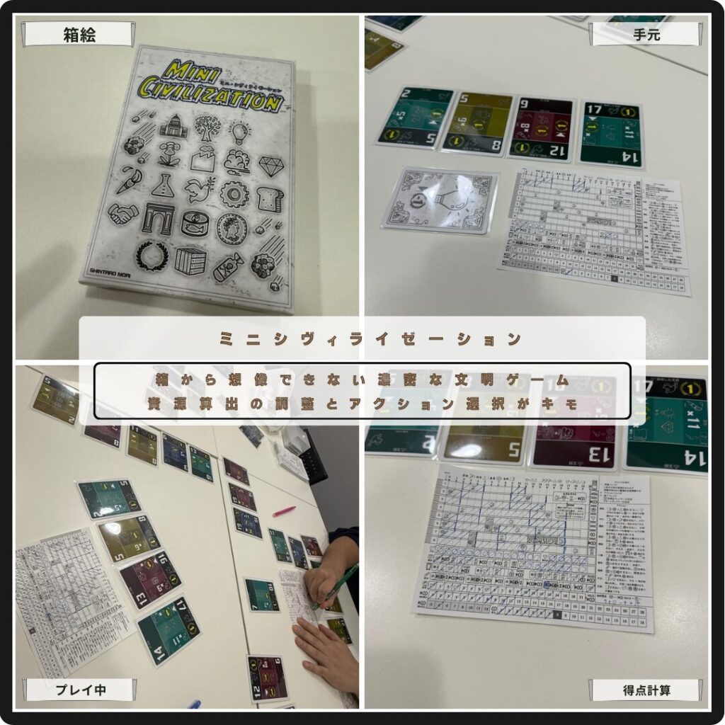 この小さい箱からは想像できない濃密なゲームになっているミニシヴィライゼーション。手元4枚のカードの数字差によって資源が生み出される、ここのパラメータ調整が新体験。手元のシートと常に睨めっこになるが確かに文明を発展させていってる感じがする。