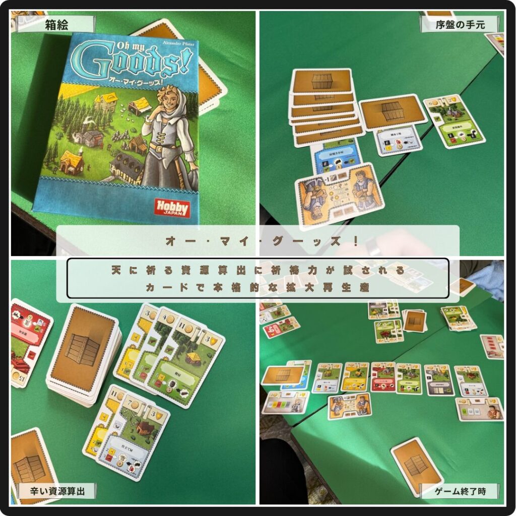 天に祈る資源算出に祈祷力が試されるオー・マイ・グーズ!。設備拡張しつつ商品を効率的に生産して勝利点を競う。設備間のチェーンを意識して拡張できると最後に勝利点を一気に伸ばせて気持ち良い。小箱なのに本格的な拡大再生産。