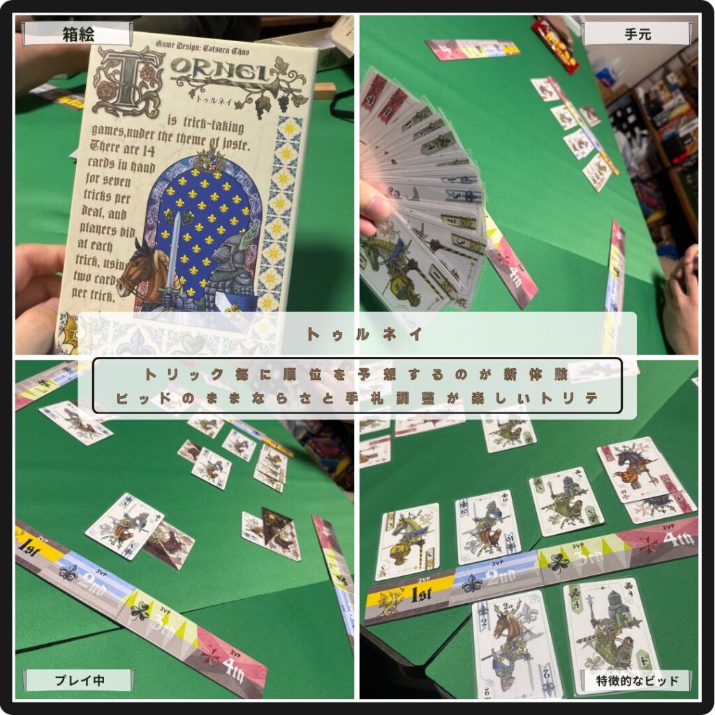 トリック毎に順位を予想する新体験トリテのトゥルネイ。手札はトリックで出すだけでなく順位予想にも用いる。意図的にボイド作ることもできれば、予想用に残しておいたカラーをマストフォローで出させられたりと儘ならない。なかなかに良いトリテ。