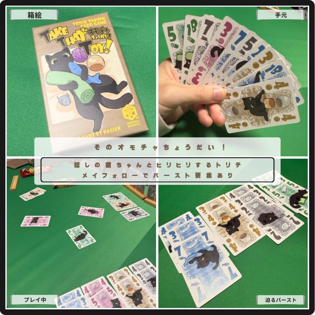 癒しの猫ちゃんとヒリヒリするトリテが醍醐味のそのオモチャちょうだい!。トリックをとって5色のカードを手元に揃えることを目指す。しかし、1色3枚を超えて獲得してしまうとバーストで失ってしまう。これとメイフォローの噛み合わせが良い。