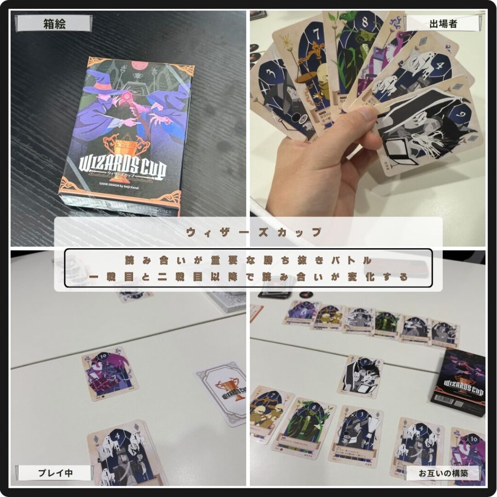 読み合いが重要な勝ち抜きバトルを行うウィザーズカップ。6人の出場者から5人をどの順番に出すか、これが悩ましい。属性や数字の大きさ、カード効果とコンボありで思案するのが楽しい。一戦目と二戦目以降で読み合いが変化する仕組みも秀逸。
