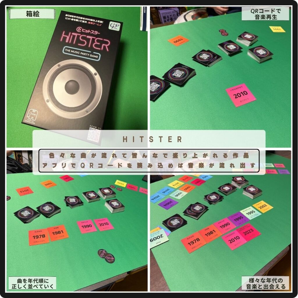 音楽を聴いてお題カードを年代順に正しく10枚並べることを目指すゲーム。お題カードのQRを読んで曲をかけ、回答者がその曲を正しい位置に配置できるとお題カードを獲得できる。プレイ中に手にするトークンを使えば、挑戦する曲を変えられたり、相手が挑戦しているお題カードを入手できるチャンスがある。