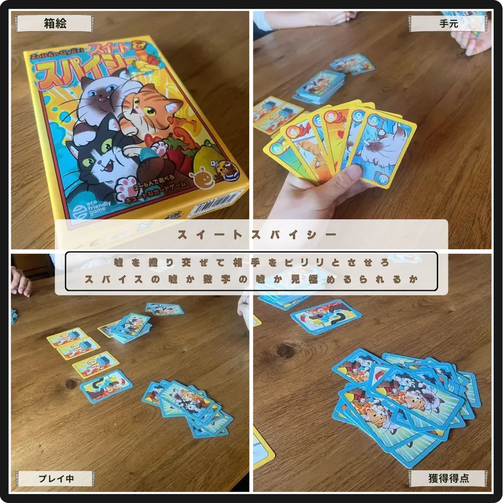 嘘を織り交ぜて相手をピリリとさせるスイートスパイシー。3種のスパイスと数字が記されたカードを使うダウトゲーム。ダウト時のスパイスか数字の嘘かの宣言がとても悩ましい。嘘が分かっていてもスパイスか数字かの選択を誤って悔しい思いをする。