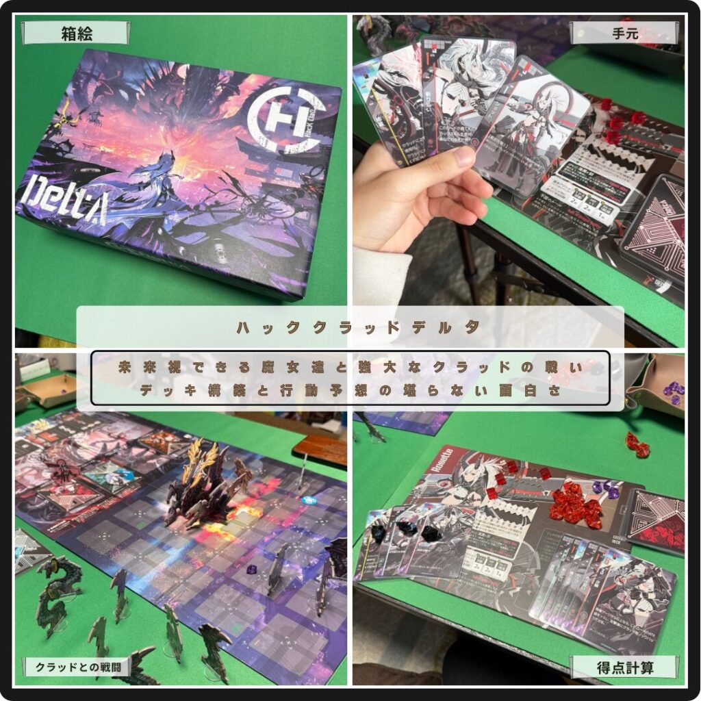 未来が視える魔女達が強大なクラッドとレギオンと戦うハッククラッドデルタ。クラッドの行動予測から上手に立ち回り攻撃を通して勝利点を稼ぐ。個性が際立つ5人の魔女にはそれぞれ固有のデッキがあり、状況に合わせて構築するのが堪らなく楽しい。