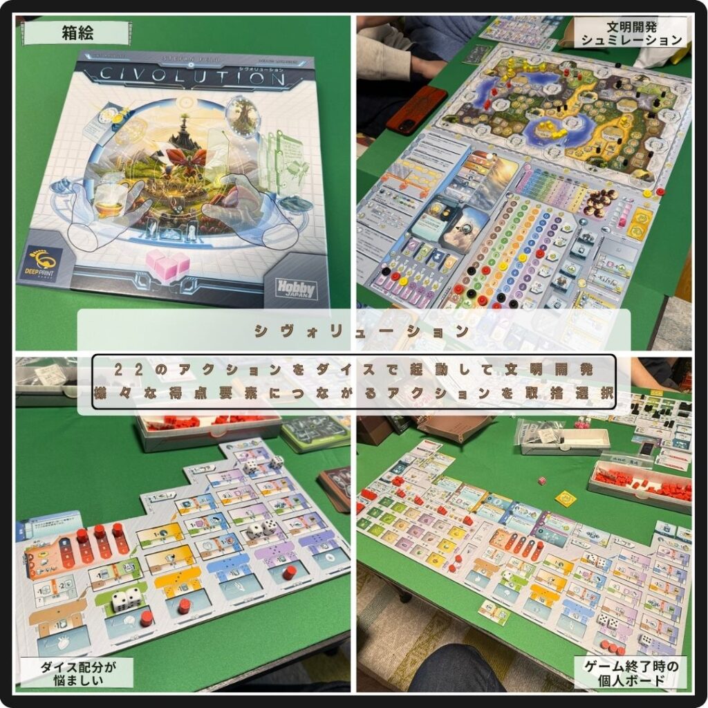 ダイス目の組み合わせによるアクション選択が面白い。6つのダイスを配分して、人口を増やしたり、資源を生み出して回収したり、カードプレイしていくが、様々な得点要素に繋がっていくので取捨選択が悩ましい。自分が育てる人類を功績・変異・建物・発明・洞察カードなどで能力強化したり、即時ボーナスを得たりといった要素もあって、いろんな戦略と方針を立てて試行錯誤できるのが楽しい。まさにシュミレーションしているといった感覚が良い。