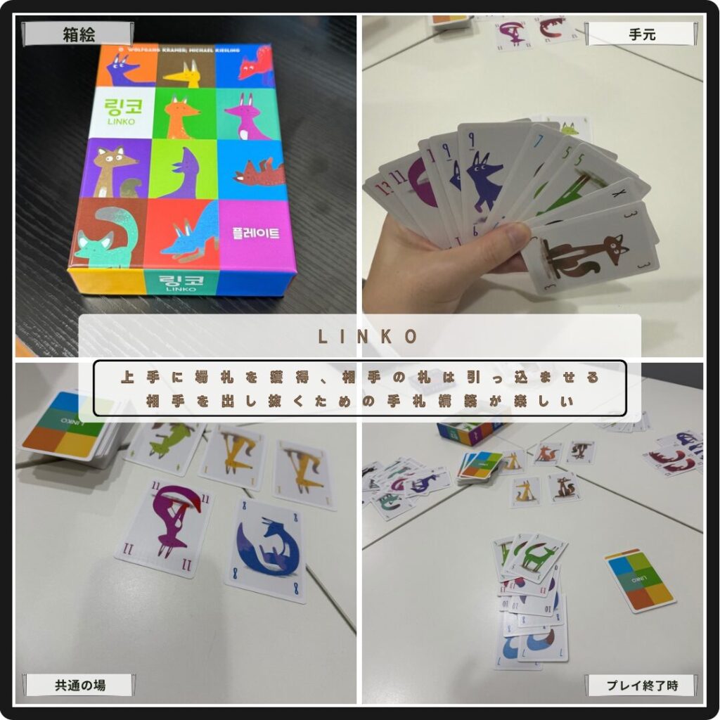 上手に場札を獲得しながら相手の札は引っ込ませるLINKO。手札を無くした時に手元に出せていた枚数が得点になる。ハイカードを持っていれば強いのだが、出し方が下手だと綺麗に上がれないことがままある。相手を出し抜く手札調整が難しい。