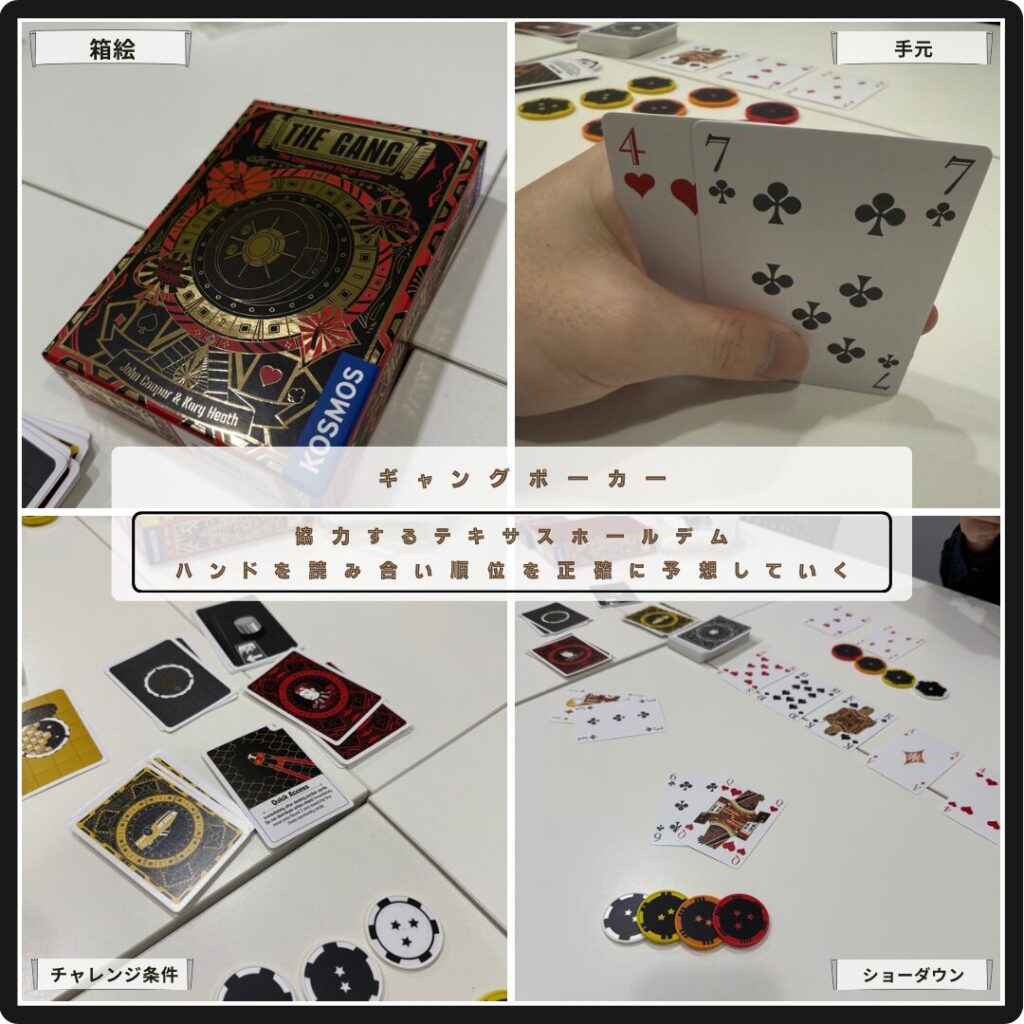 テキサスホールデムで協力ゲームをするギャングポーカー。お互いのハンドを読み合いながら、順位を正確に予想する。フロップ・ターン・リバーで相手のスタンスがどう変化したかの見極めと、自分のハンドの強さをどう伝えるのかが悩ましい。