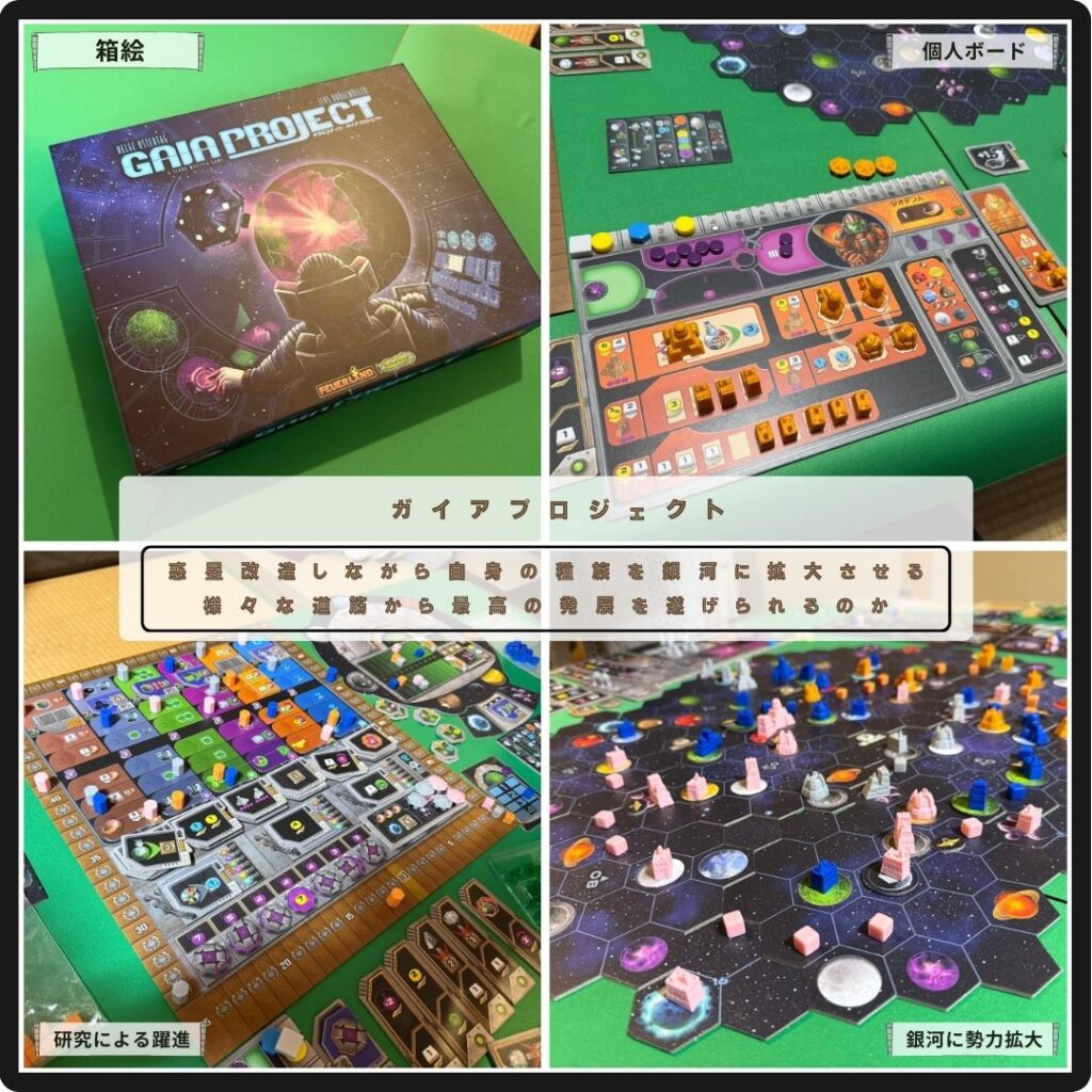 惑星改造して自身の種族を銀河に拡大させるガイアプロジェクト。固有の能力を有した様々な種族から1つ選び、勢力拡大させて勝利点を得る。適切な資源管理、能力拡充と勢力拡大、他プレイヤーとのインタラクションから濃厚なゲーム体験が得られる。