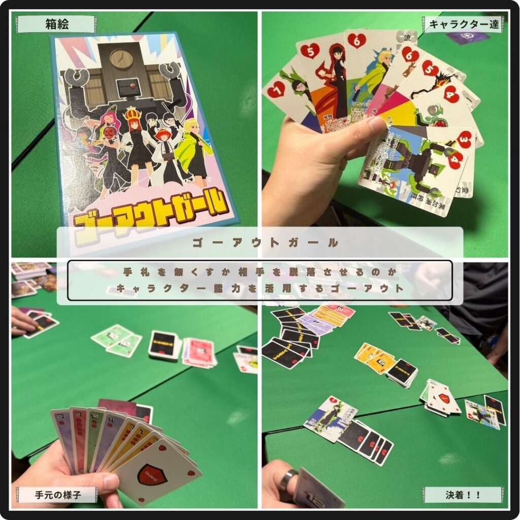 手札を無くすか相手を脱落させるかして勝利を目指すゴーアウトガール。場札よりハイカードなら出せる、但しパスするとライフを失ってしまい脱落に近づいてしまう。キャラクター能力を活用して勝利を目指す新感覚ゴーアウトゲーム。