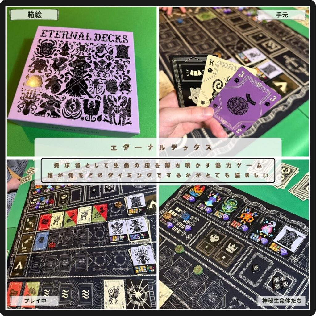 探求者として生命の謎を解き明かす協力ゲームのエターナルデックス。手札が尽きる前にステージクリアを目指す。各プレイヤーは各々デッキを持つが、補充のタイミングを考えないと手詰まりになってしまう。アートとシステムに魅了される一作。