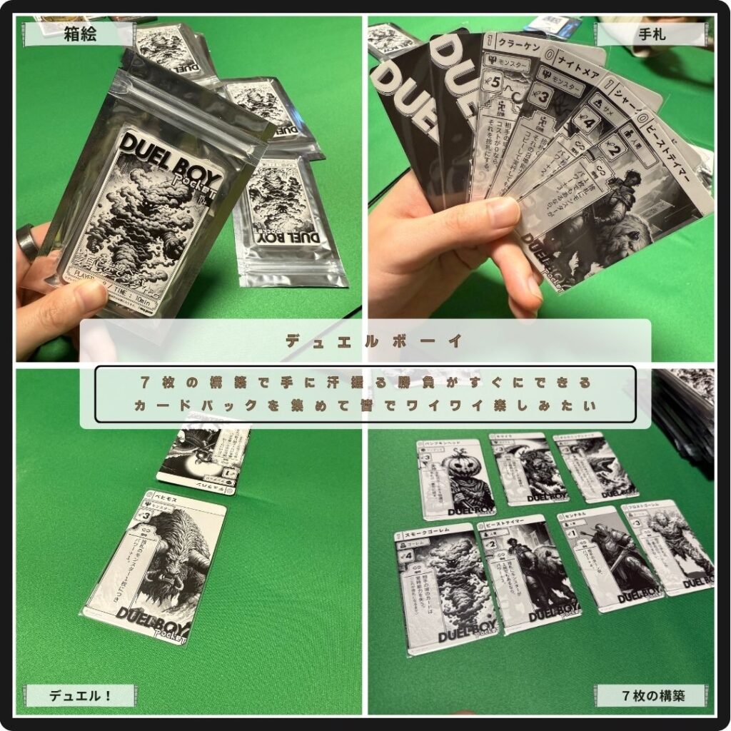 7枚の構築で手に汗握る勝負がすぐにできるデュエルボーイ。カードを召喚!強さを比べて勝敗を決する。先に相手の手札を枯渇させればゲームに勝利。ミニマムなルールだけどカードシナジーを考えて遊べばデュエリスト気分。