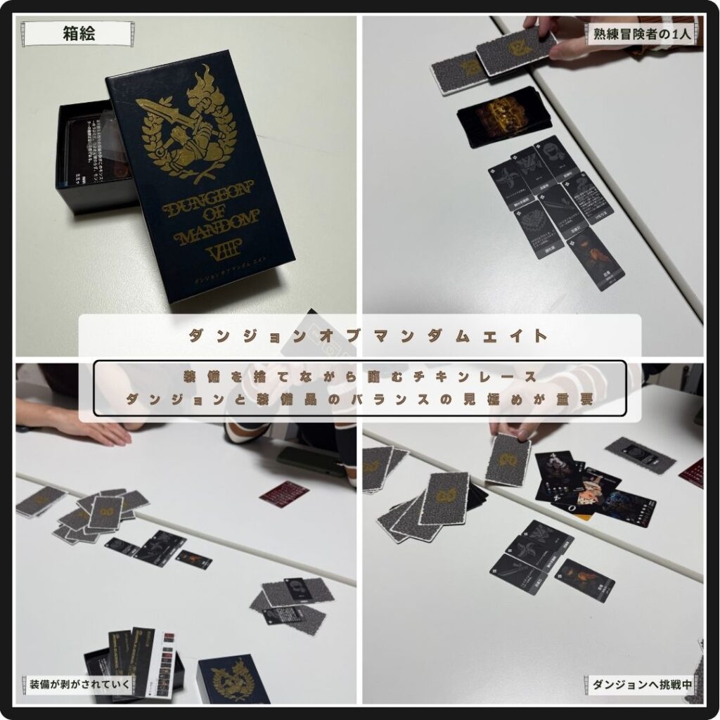 ダンジョンを舞台にしたチキンレースが楽しめる。ダンジョンオブマンダムエイト。手番ではモンスターをダンジョンに配置するか、冒険者の装備をハズすか決める。ダンジョン難易度と装備品の均衡を見極めて、生還できた時の達成感は堪らない。