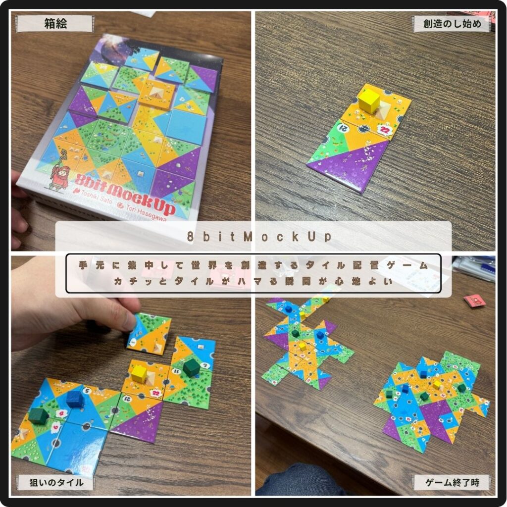 世界を創造するタイル配置ゲームの8bitMockUp。地形が揃うように辺をつなげてタイルを配置。全プレイヤーが同じタイルセットを用いて、同じタイルを配置していく。出来上がる世界は皆バラバラ。狙っているタイルが来て、手元にカチッとハマると心地よい。