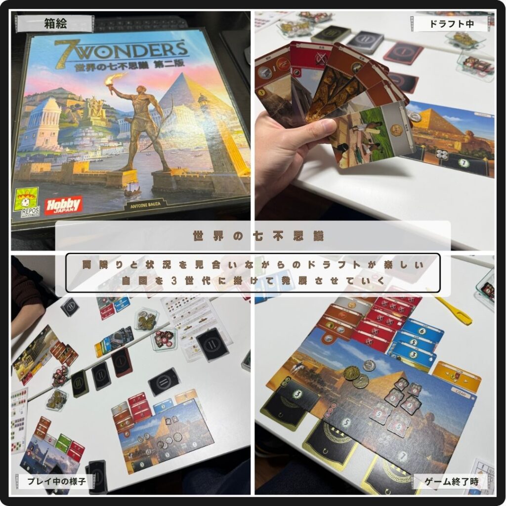 両隣と状況を見合いながらのドラフトが楽しい世界の七不思議。特定の要素を持ったカードをドラフトして集めながら、自国を3世代に掛けて発展させていく。軍事国家に引っ張られて軍備増強したり、資源貿易で仲良くしたりとインタラクションが楽しい。