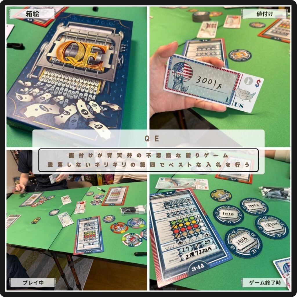 値付けが青天井の不思議な競りゲームのQE。タイルを入札してそこに描かれた得点要素を集めていく。入札にいくらでもお金を使えるが、ゲーム終了時に一番お金を使っていたプレイヤーは脱落となり得点計算に参加できない。金銭感覚を研ぎ澄ませる競りが面白い。
