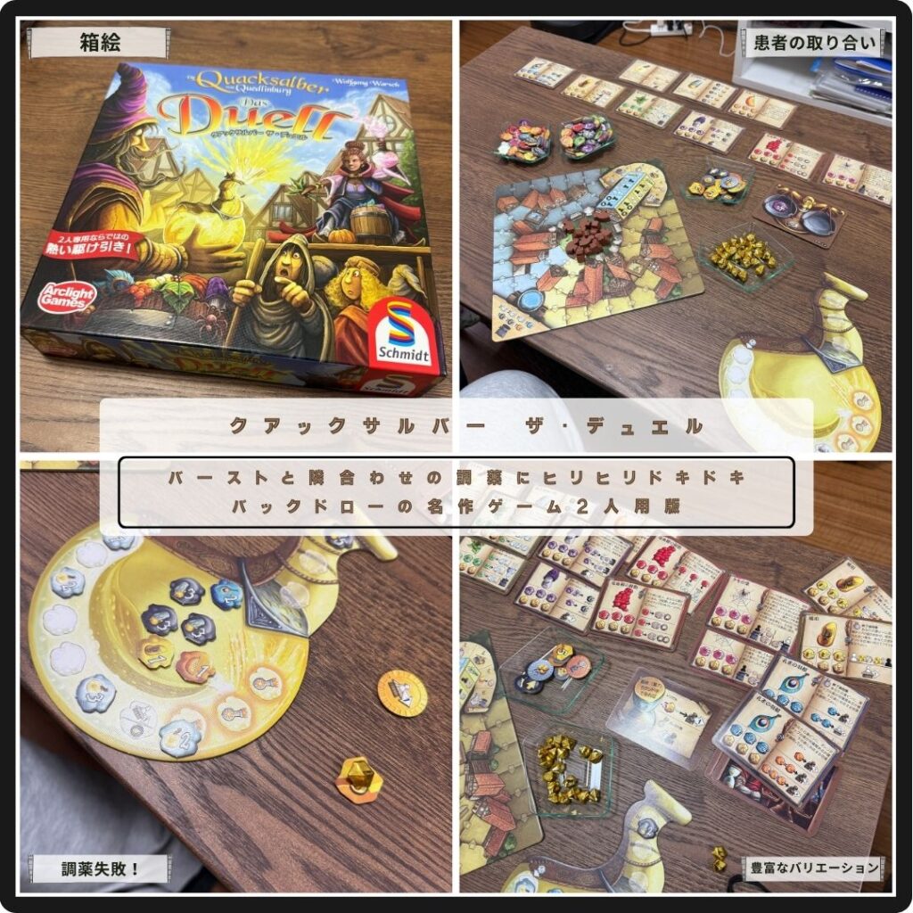 バーストと隣り合わせの調薬にヒリヒリするクアックサルバー ザ・デュエル。広場に集まった患者を自身のテントに引き込んで治療する。勝つためにギリギリを攻めるとバーストしてしまう。2人用に仕上がったバックドローの名作。