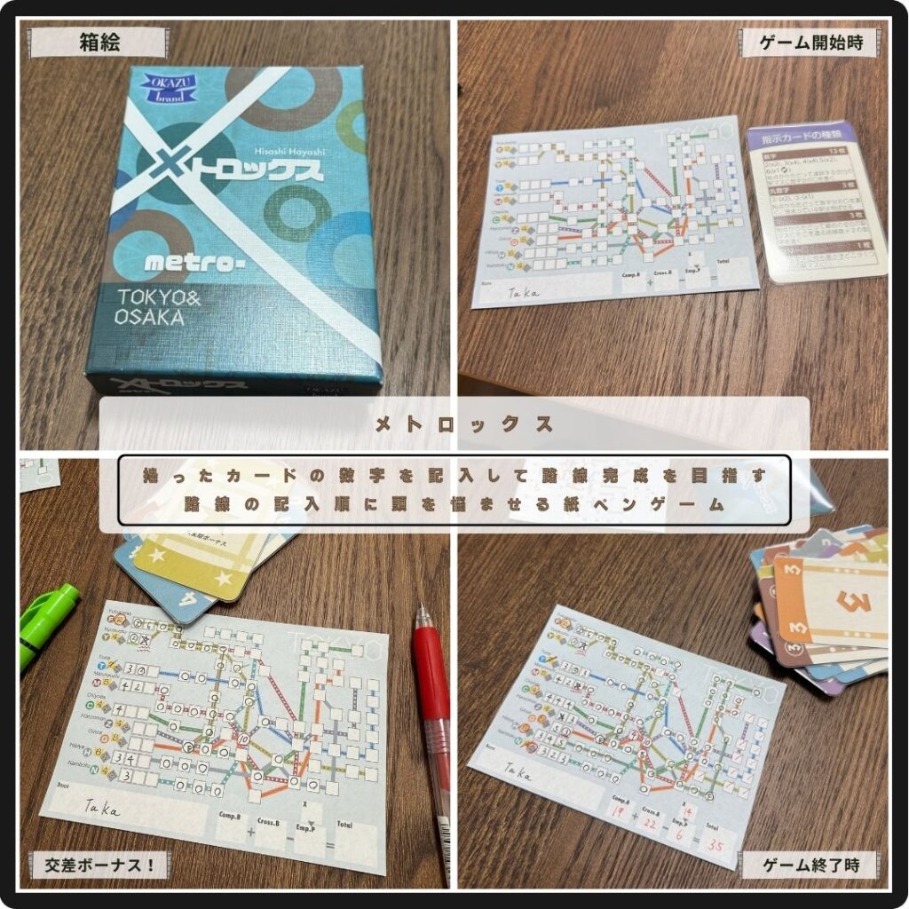 捲ったカードの数字を記入して路線完成を競うメトロックス。数字を記入して始点から終点まで○を埋められると路線完成で得点入手。路線と路線が合流する箇所もあり記入順を考えさせられる。1回目はよく分からないが遊ぶほど上達するタイプのゲーム。