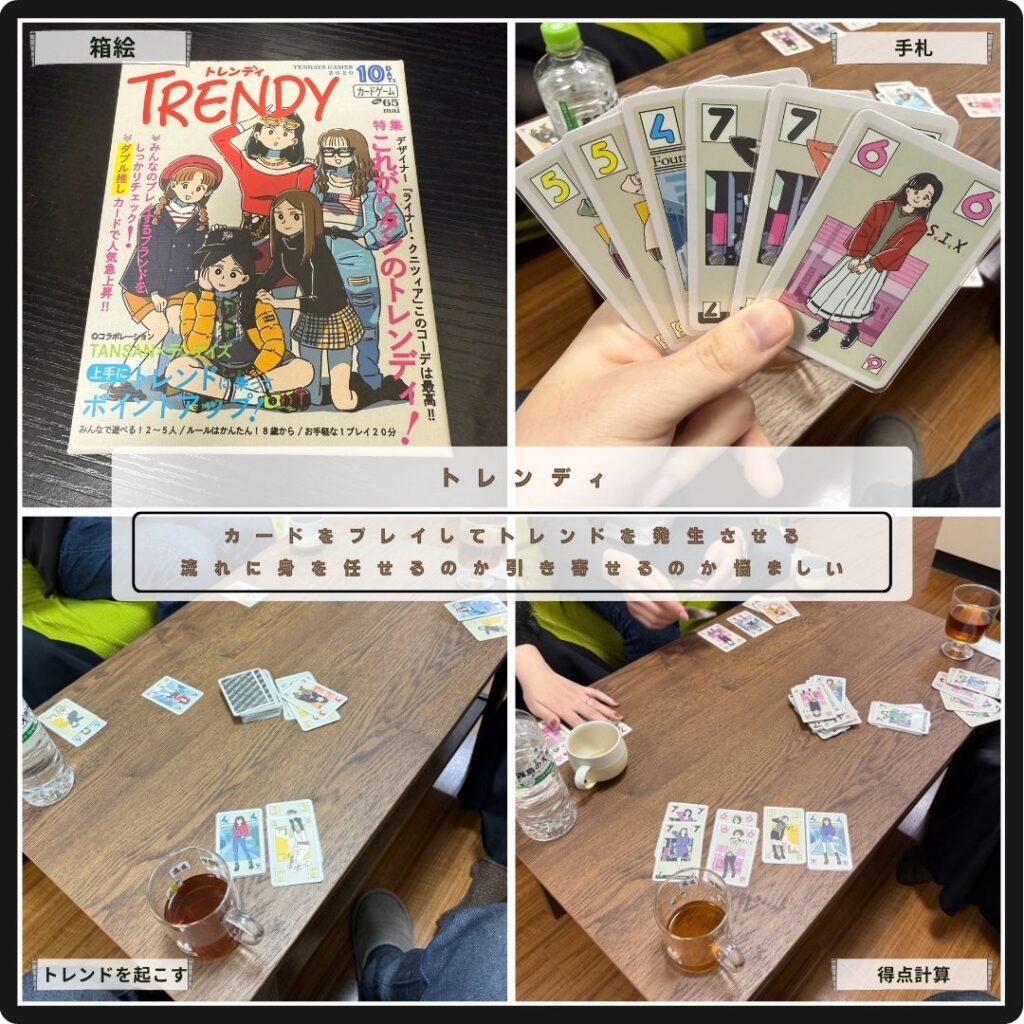 狙いのブランドをトレンドにして得点を稼ぐトレンディ。一定枚数のカードが場に揃うとトレンド化。得点チャンスだが、トレンド以外の場札は流れてしまう。相乗りしていると勝負に勝てないが一人相撲では得点に結びつかない、このジレンマが悩ましい。
