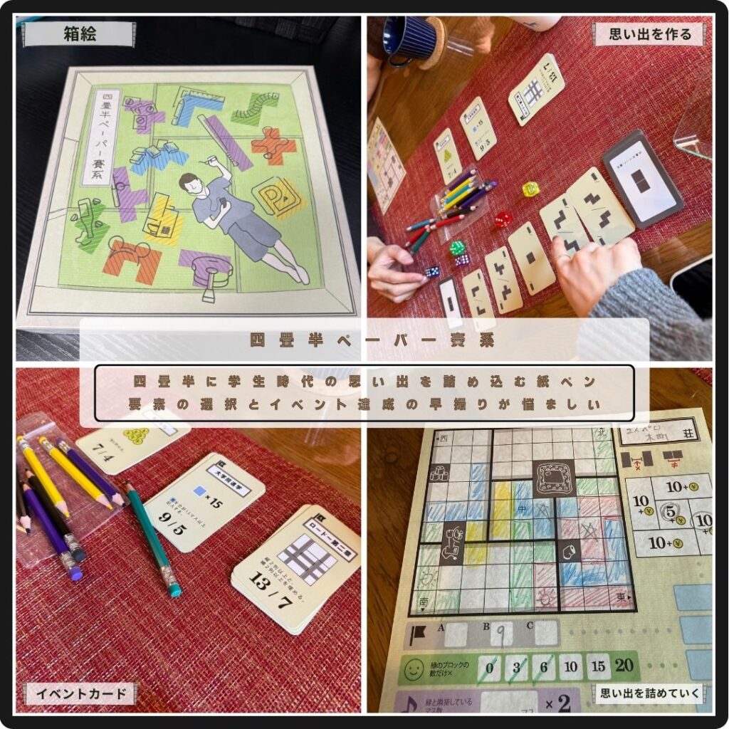 四畳半に学生時代の思い出を詰め込む紙ペンゲームの四畳半ペーパー賽系。交友・趣味・恋愛・勉強・バイトの5要素を塗りこんでいく。要素の取捨選択とイベントの早取りがやはり面白い。4or5マスのブロックは前半は嬉しいが後半は苦しい。