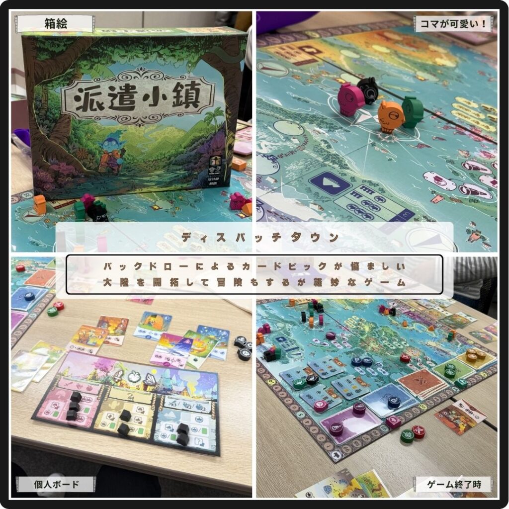 バックドローによるカードピックが悩ましいディスパッチタウン。3ラウンドを通じて9枚のカードをピックするとゲームが終了する軽妙さにビックリ。どこを優先するのか、そのために何を獲得すれば良いのかがとても悩ましい。