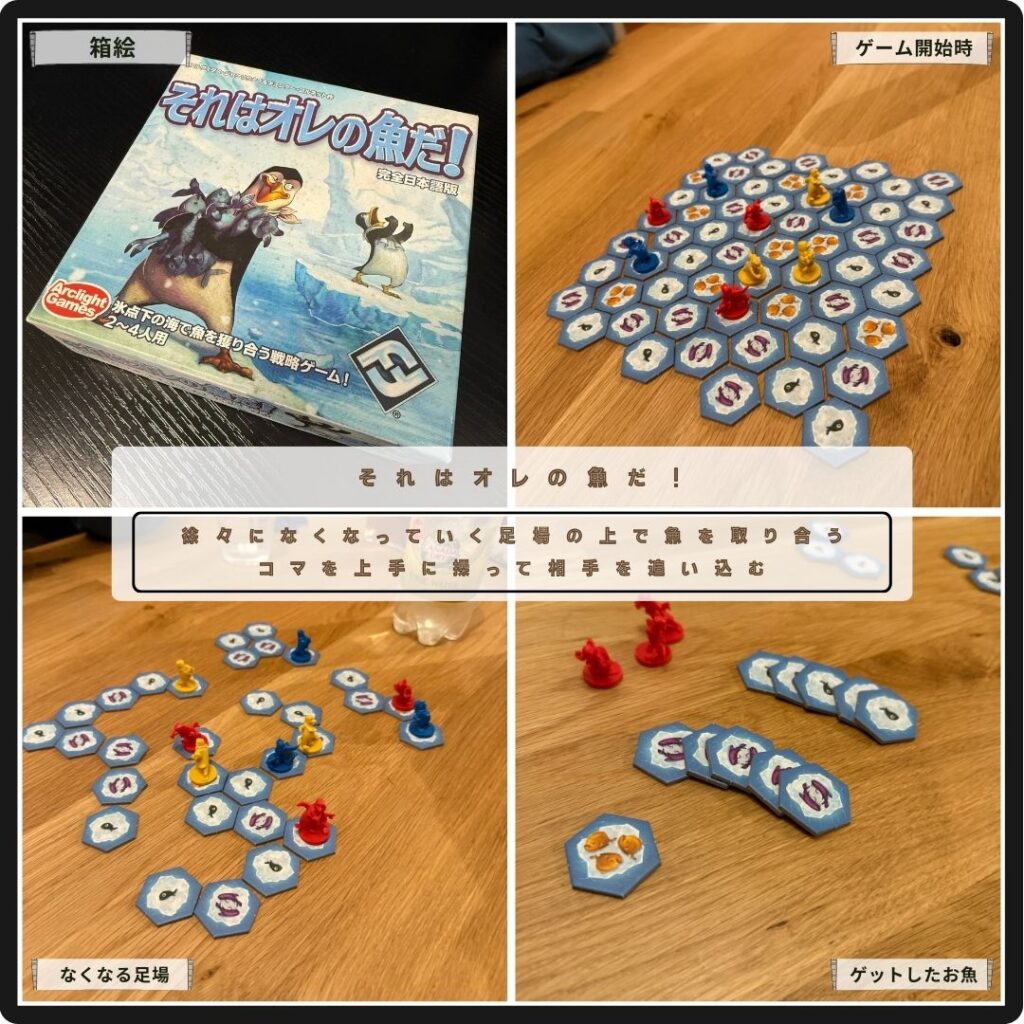 徐々になくなる足場の上で魚を取り合うそれは俺の魚だ!持ち駒を動かして足元の魚を獲得していく。魚が取られていくと動ける足場も無くなっていく。コマを上手に操って相手が動けなくなるように追い込んでいく。