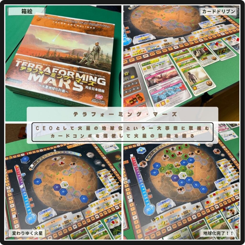 企業CEOとなって様々なプロジェクトを実行。オールユニークな数百種類のカードを活かすのがカギ。火星に海を引き、酸素・気温を改善させて、最も地球化に貢献できたプレイヤーが勝者となる。
