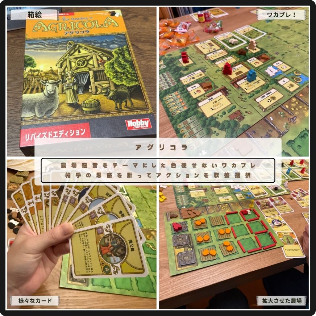 農場経営をテーマにした色褪せないワカプレが体験できるアグリコラ。家族コマを配置してアクション実行。後からそのアクションは実行できないため、読み合いとアクションの優先順位付けがとても悩ましい。自分の農場が発展していくのは見ていても楽しい。
