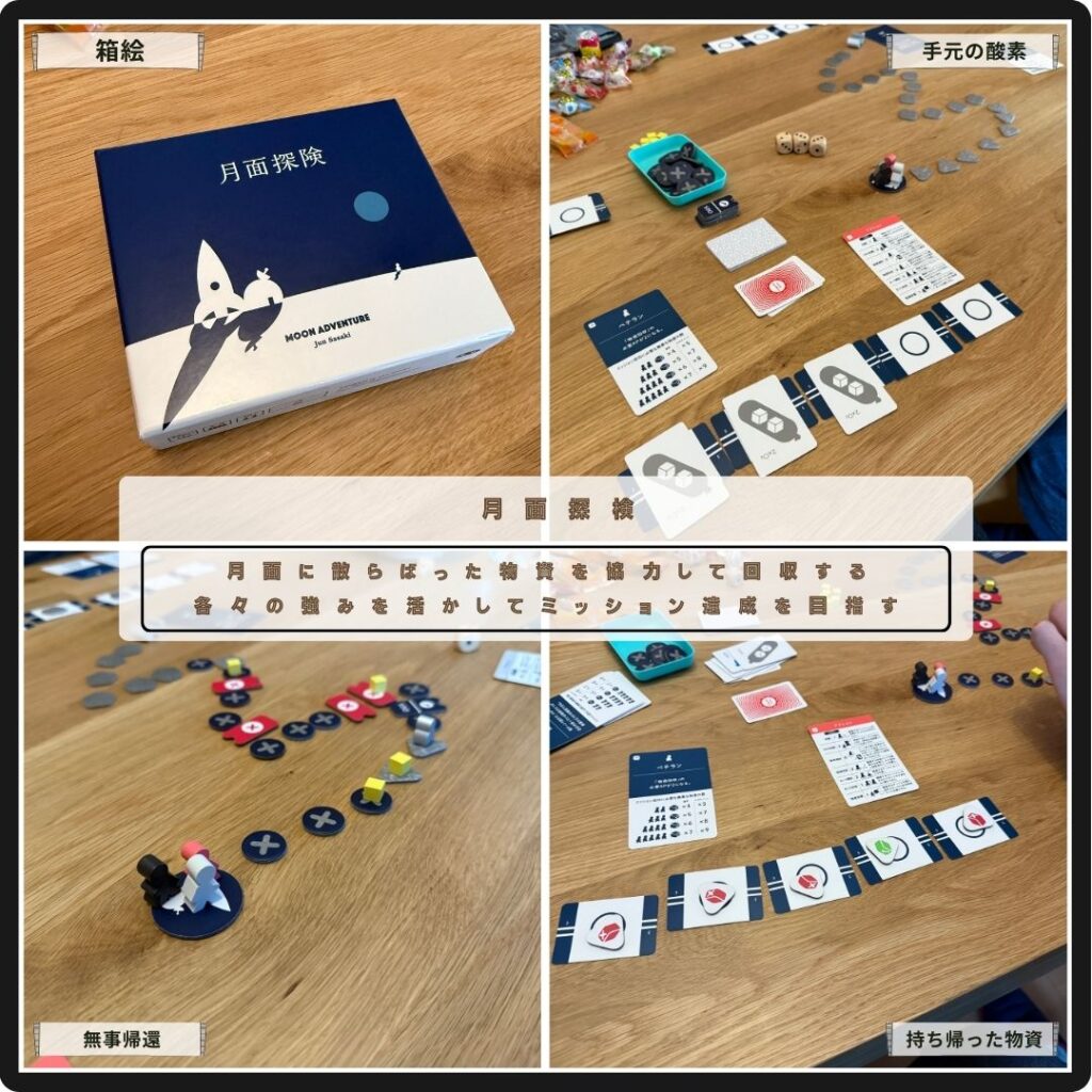 月面に散らばった物資を協力して回収する月面探検。酸素を消費してアクションポイントを獲得、様々なアクションを実行してミッション達成を目指す。各々に個性ある役割が割り当てられ、ゲーム毎に違う戦略を考えることになるのが楽しい。