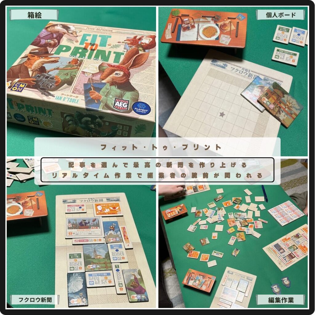 記事を選んで最高の新聞を作り上げるフィット・トゥ・プリント。リアルタイムタイル配置ゲーム。場の記事を手元に確保、そしてレイアウトしていく。広告を掲載しないと得点計算に参加できない仕組みもニクい。テーマとシステムが噛み合った一作!