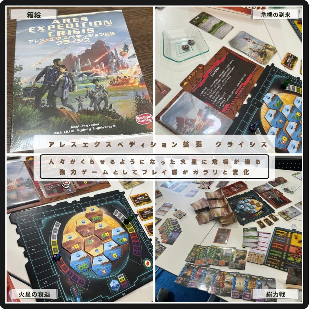 人々が暮らせるようになった火星に危機が迫るクライシス アレスエクスペディション拡張。ラウンド毎に危機カードが火星を衰退させるのをプレイヤー全員で強力して対処する。カードプレイに焦点を当てたテラフォーミングマーズのプレイ感をガラリと変えてくる。