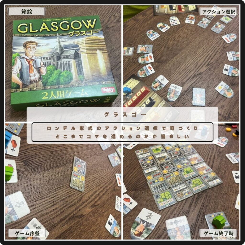 ロンデル形式のアクション選択で町づくりするグラスゴー。円形に並べられたアクションタイルにコマを配置して資源を得たり、建物立てたりする。建設した建物のコンボ要素あり!コマをどこまで進めてアクションを行うのかが悩ましい2人用ゲーム。