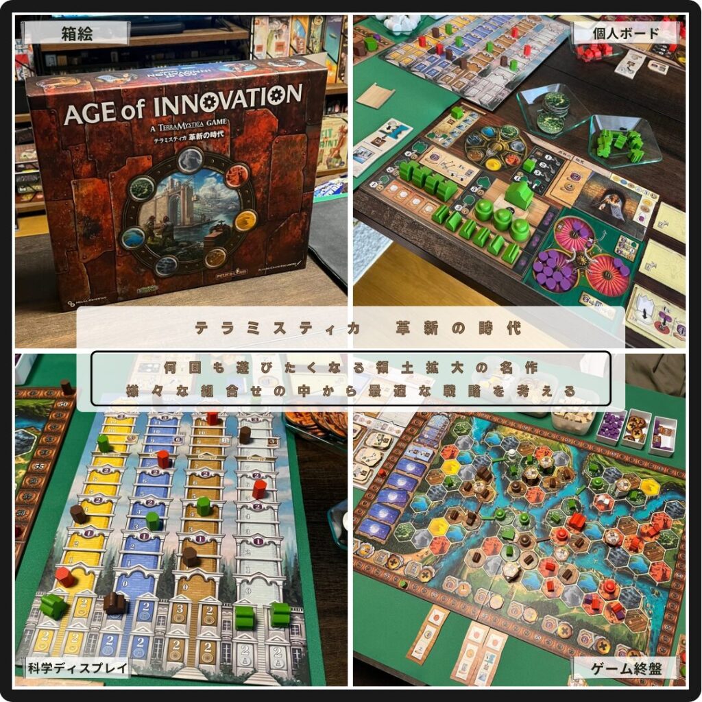 領土拡大ゲームの名作テラミスティカ 革新の時代。勢力の個性を活かしながら能力改善しつつエリアを広げていく。競合するだけじゃなく互助するエリア取りが新鮮。応用が効くパワー回しが楽しい。ゲーム毎に様々な要素の組合せが変わるから、何回も遊んでみたくなる。