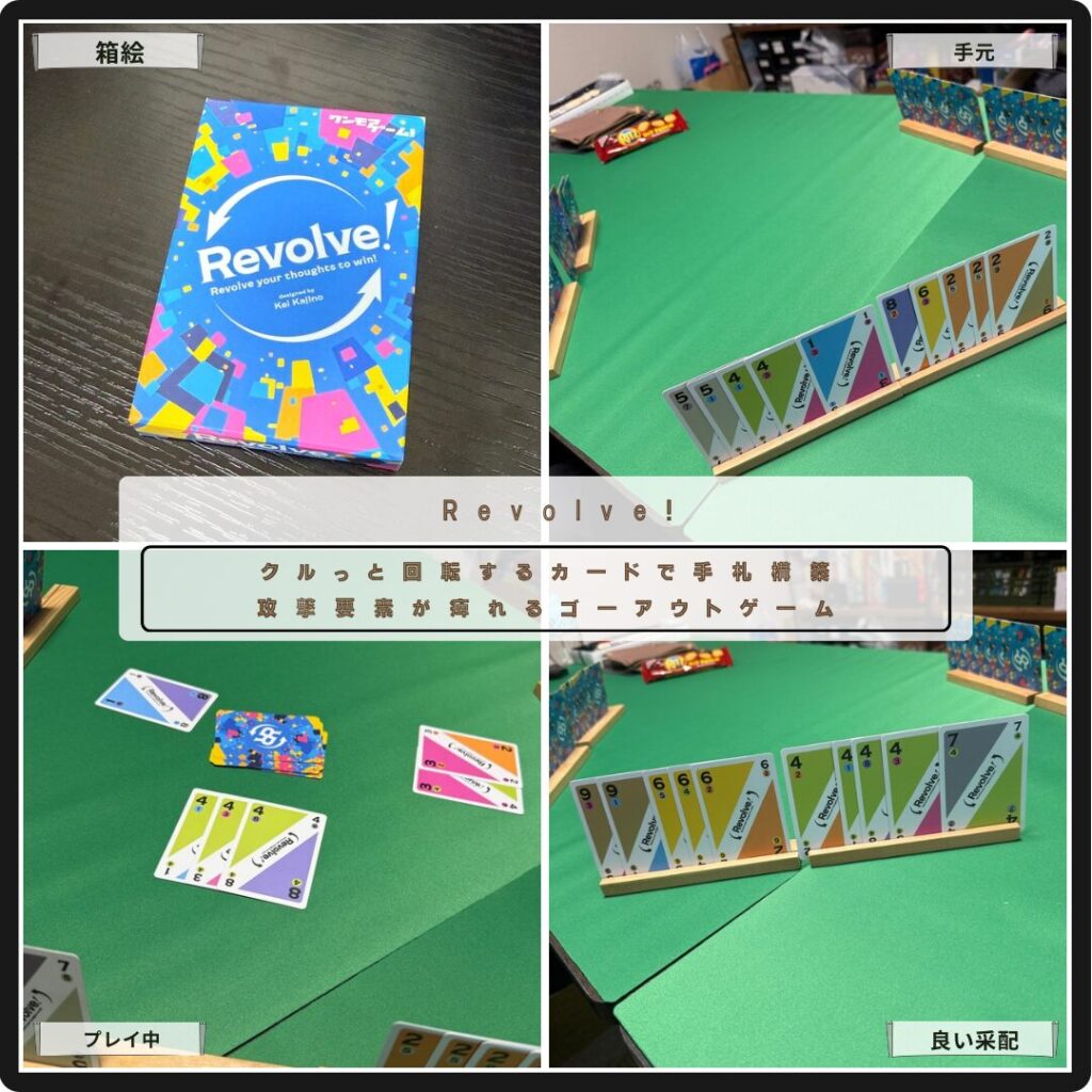 攻撃要素が痺れるゴーアウトゲームのRevolve!。回転するカードで手札を構築しながら、上手に失くしていく。場札よりハイカードをプレイすると持ち主に場札を引っ込めさせられる。クルッと回転させたり、させられたりの独特なシステムが癖になる。