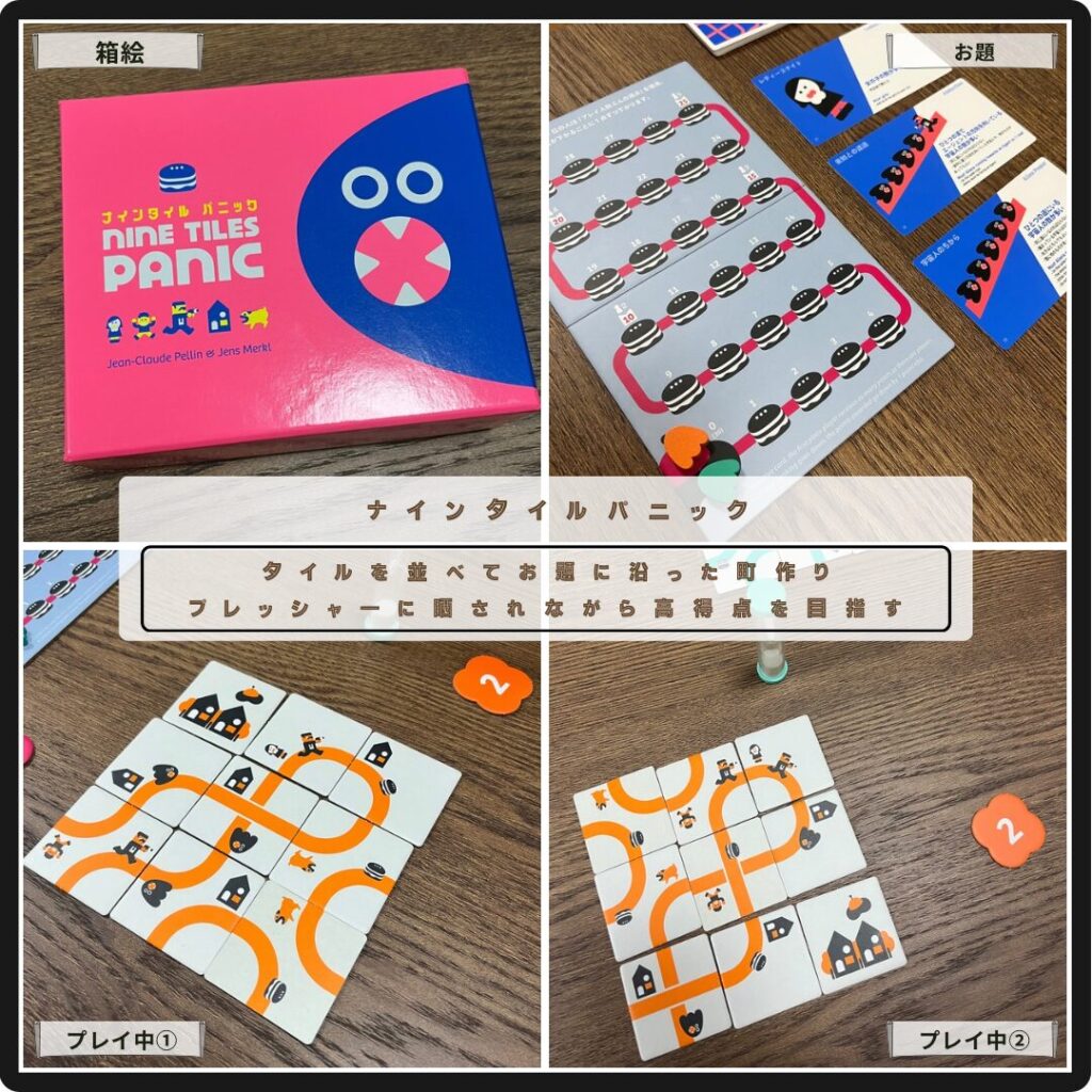 時間と勝負して高得点を目指すナインタイルパニック。お題に沿ってタイルを3×3の形に配置して町づくり。得点を稼いで先に規定点に達すれば勝利。先に町を完成させてプレッシャーをかけるのか、プレッシャーに晒されながら高得点を目指すのか、とても悩ましい。
