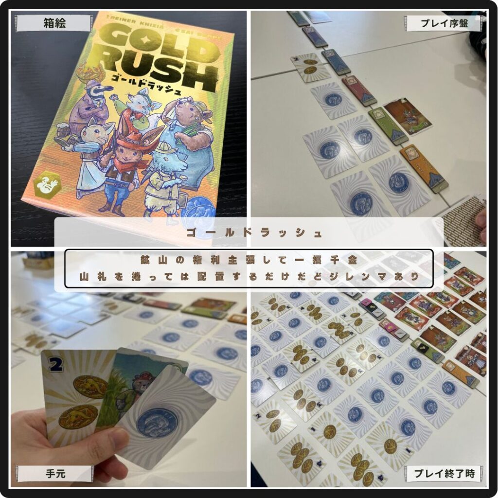 鉱山の権利主張して一攫千金を目指すゴールドラッシュ。山札からカードを捲り中央の鉱山に配置。各鉱山から金を最も獲得できたプレイヤーが勝利。狙いの鉱山がバレるとどんどん鉄屑が押しつけられてしまう。山札を捲っては配置するだけなのに悩ましい。