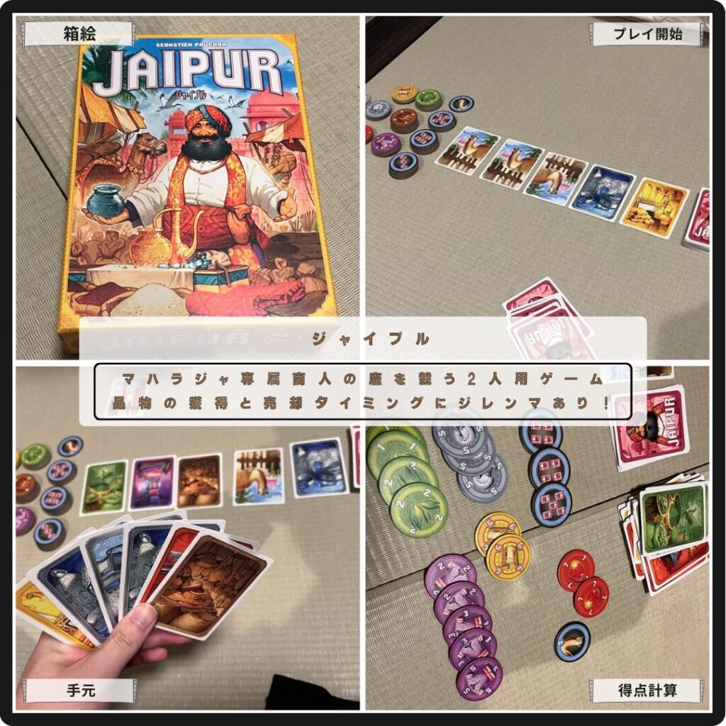 マハラジャ専属商人の座を勝ち取る2人用ゲームの定番ジャイプル。商品売買で相手よりお金を稼げば勝利。手番では品物の獲得か売却ができ、3個以上まとめ売りボーナス点が大切。獲得と売却のタイミング、絶妙な手札上限に2人用ゲームの駆け引きが詰まっている。