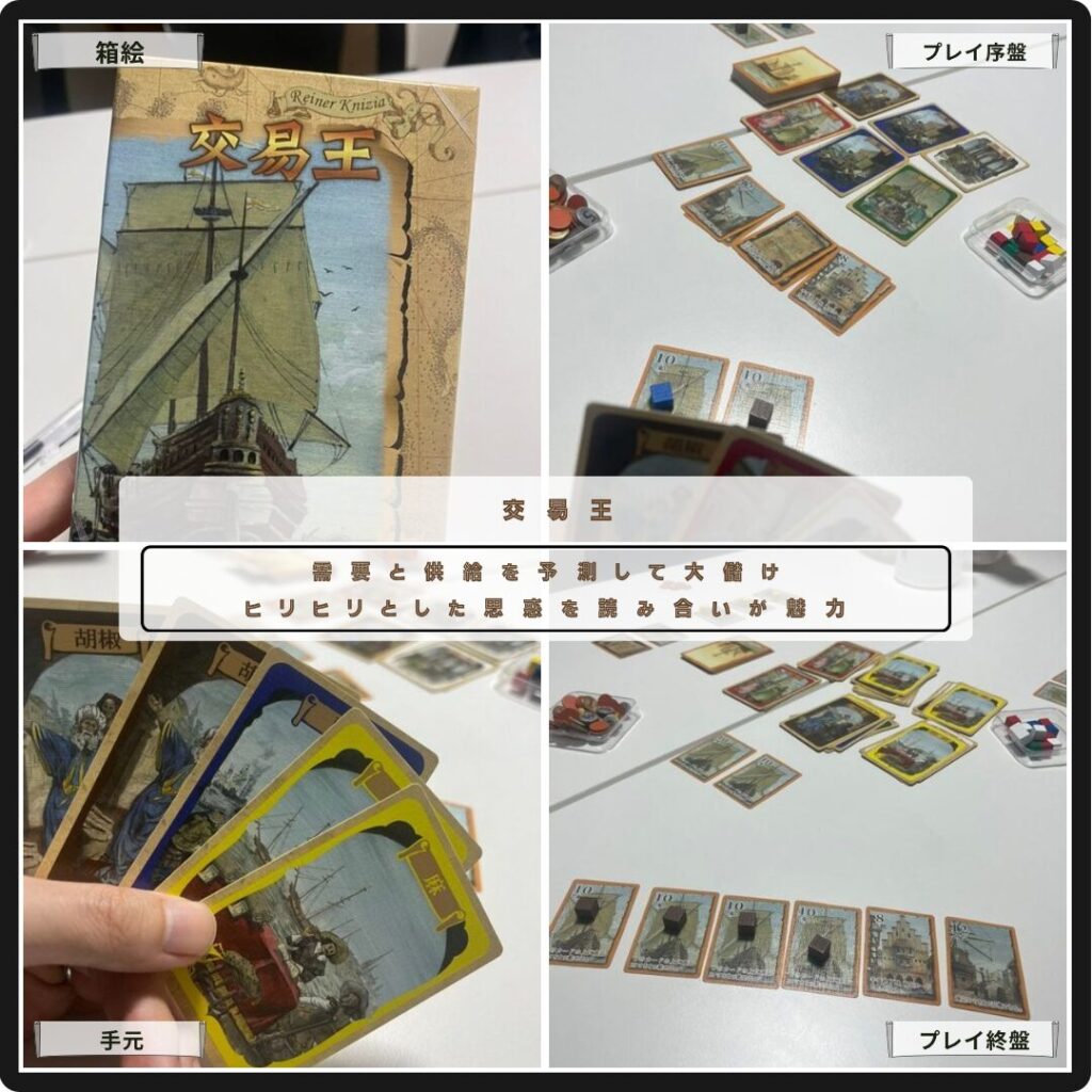 需要と供給を予測して大儲けする交易王。6種の商品を供給してお金を稼ぐ。場の6枚は需要を示し、手札から商品カードをプレイして需要操作できる。他プレイヤーの思惑を読みながらヒリヒリしたプレイ感が魅力的。収入最大化の戦略を考えるのが楽しい。