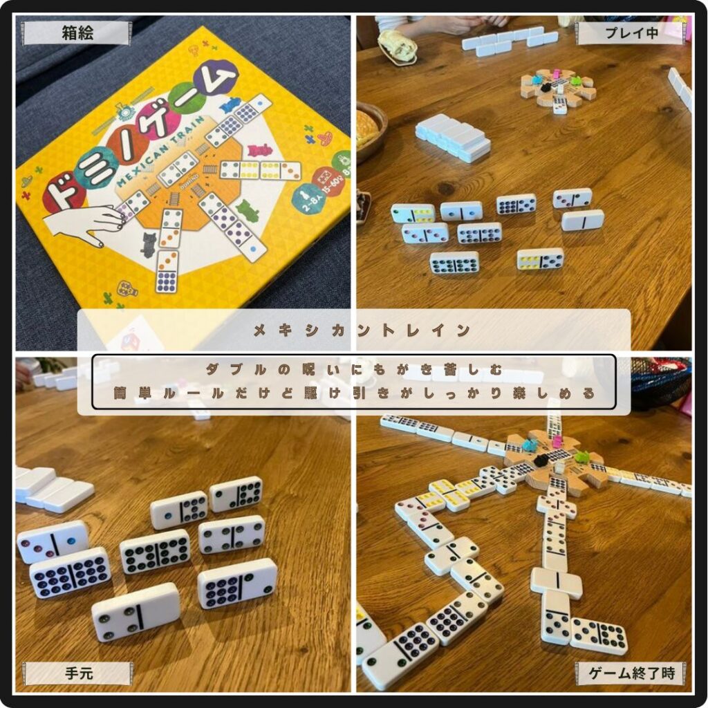 ダブルの呪いにもがき苦しむメキシカントレイン。ドミノタイルを順番に場に出して、手牌を無くしたら得点計算。手牌が出せず苦しい時に、他プレイヤーの行動で救われることもあれば、順調な時に妨害されたりもする。簡単ルールだけどきっちり駆け引きが楽しめる。