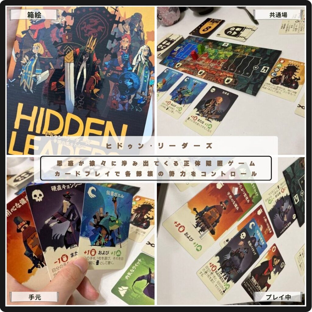 思惑が徐々に滲み出てくるヒドゥン・リーダーズ。2つの部族に支持されるリーダーに扮して、各部族の英雄を動かしながら暗躍。カードプレイで各部族をコントロールしながら、相手の正体を推測したり自分の正体を誤認させたりと正体隠匿の妙が味わえる。