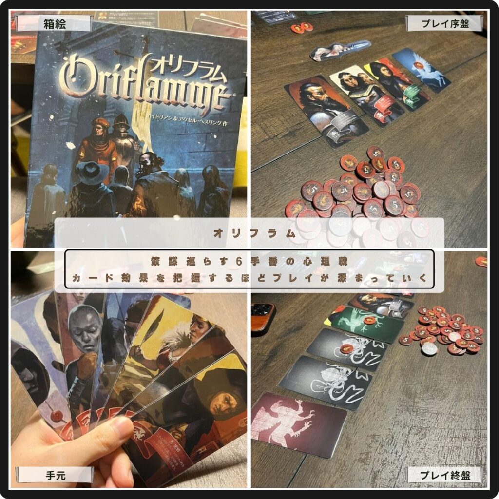 策謀巡らす心理戦が味わえるオリフラム。6手番で最も勝利点を稼いだプレイヤーが勝利。カード効果の処理順を踏まえたカード配置がキモ。気づいたら搾取されつづけるカード配置になってたことも。カード能力を把握するほどプレイが深まっていく軽量級ゲーム。