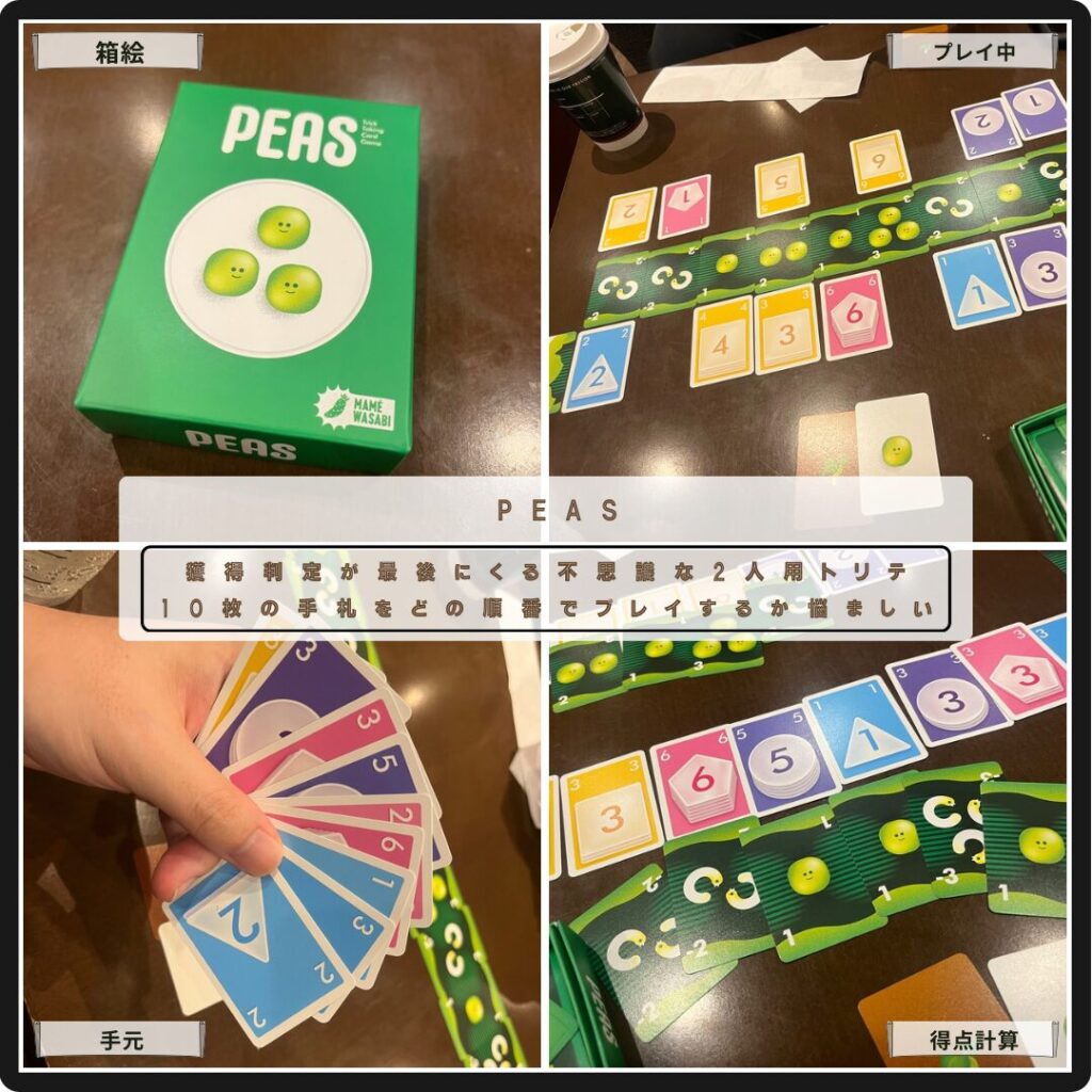 獲得判定が最後に行われる2人用の不思議なトリテPEAS。場の中央に並べた豆を取り合って、点数の高かった方が勝利。10枚の手札をどの順番でどこにプレイしていくかが悩ましい。豆が沢山とれたと思っていても、虫を取らされて結局負けていたなんてことも。