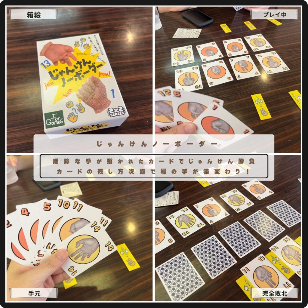最後まで自分の手が確定しないじゃんけんノーボーダー。曖昧な手が描かれたカードでじゃんけん。グー・チョキ・パーの境界は最後に残した2枚で決まる。カード1枚の切り方次第で場の手は様変わり、不思議なじゃんけん勝負が楽しい軽量ゲーム。