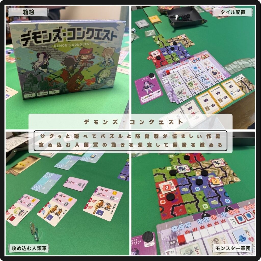 プレイ時間は30~40分くらいだけど、プレイ感は濃密。人類軍の攻撃を考慮しつつ、モンスター召喚のためのマナ産出、得点要素を意識してタイル配置を模索するのが楽しい。人類軍の攻撃でタイルが破壊される時、ケアを怠ると連鎖的に崩れてしまうのも、緊張感があってプレイが引き締まる。
