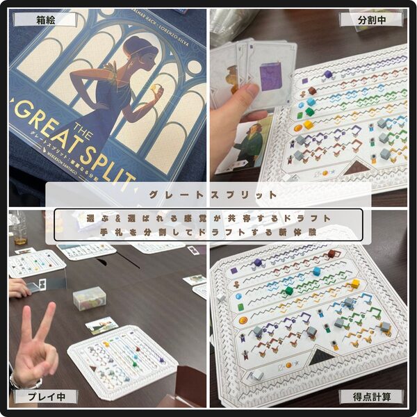 手札の分割とドラフト、そしてパラメータ上げが気持ち良いグレートスプリット 。カード巡りが独特で、隣の人の采配にも一喜一憂する。パラメータ上げはボーナス獲得による連鎖もあり、上手くハマると大きく点数が伸びてくれる。新しい体験が得られるドラフトの一作。
