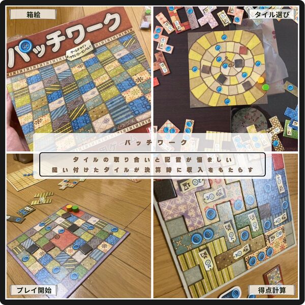 タイル選びのジレンマが堪らないパッチワーク。ポーンから3つ目までのタイルを選んでコストを払って手元に配置。縫い付けたタイルは決算時に収入をもたらしてくれる。タイルの取り合いと配置が悩ましい2人用の名作。